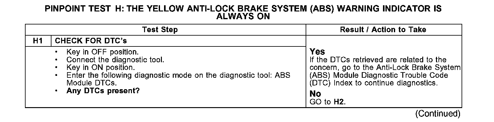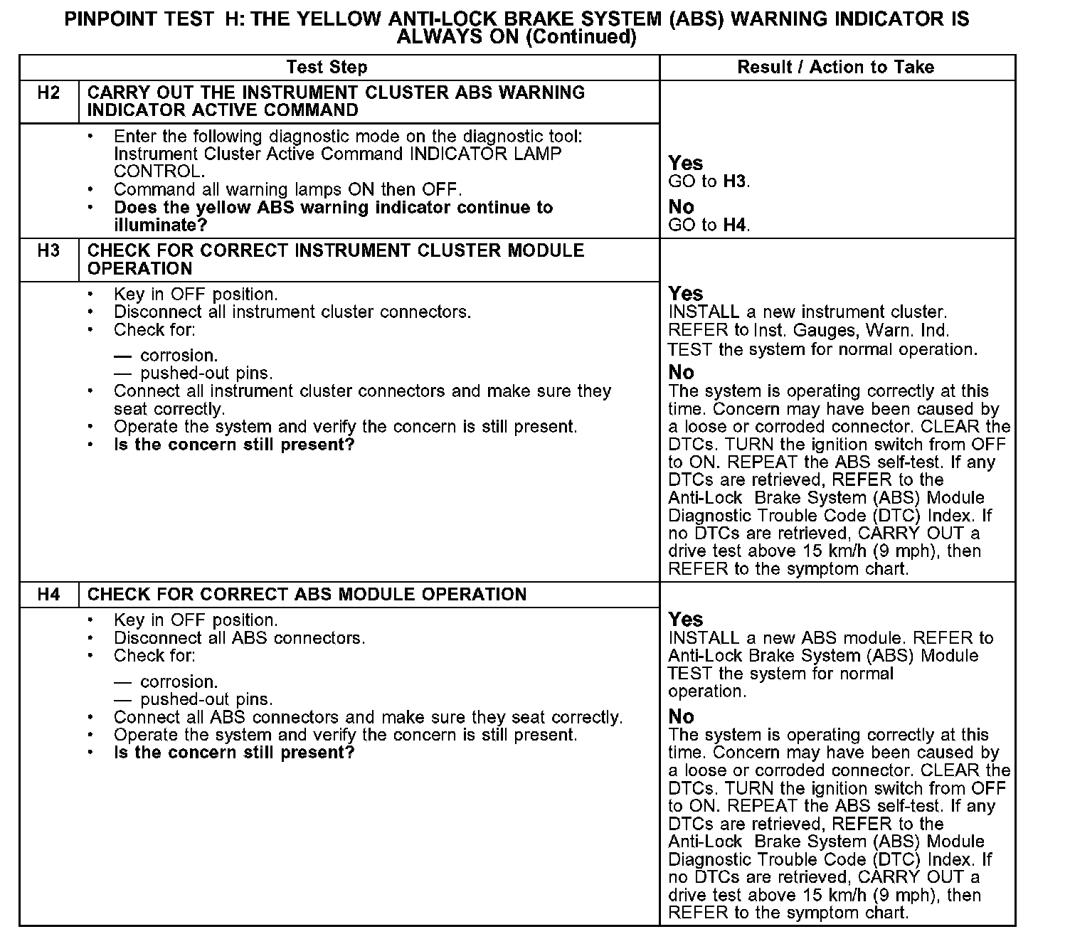 Pinpoint Test H: The Yellow Anti-Lock Brake System (ABS) Warning Indicator Is Always OnNormal Operation