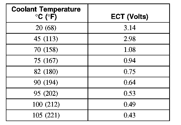 4. Start the engine and allow the engine to idle throughout this test. Allow the engine to run for 2 minutes, then record the ECT voltage. Record the ECT voltage every 60 seconds. When the ECT voltage trend changes direction or only changes slightly (0.03 volt or less) from the previous reading, record this as the thermostat opening voltage. Use the voltage and corresponding coolant temperature chart.