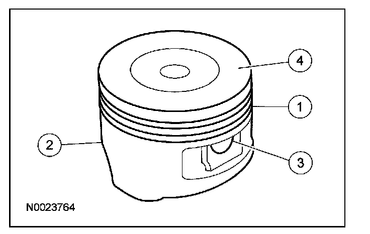 1. Clean and inspect the (1) ring lands, (2) skirts, (3) pin bosses and the (4) tops of the pistons. If wear marks, scores or glazing is found on the piston skirt, check for a bent or twisted connecting rod.