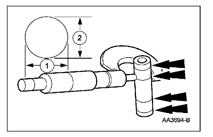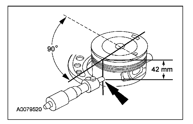 1. Measure the piston diameter 90 degrees from the piston pin and 42 mm (1.65 inch) down from the top of the piston at the point indicated.