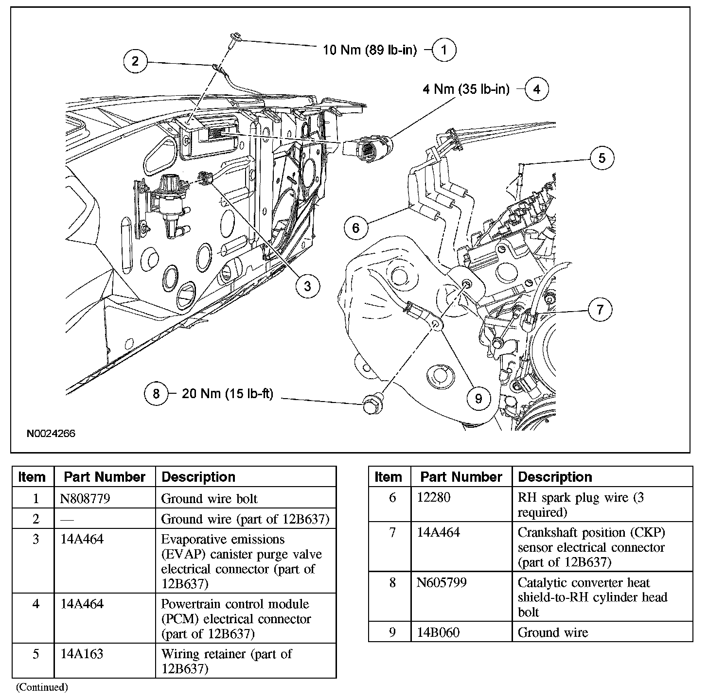 5. Position the ground wire and install the catalytic converter heat shield-to-RH cylinder head bolt.