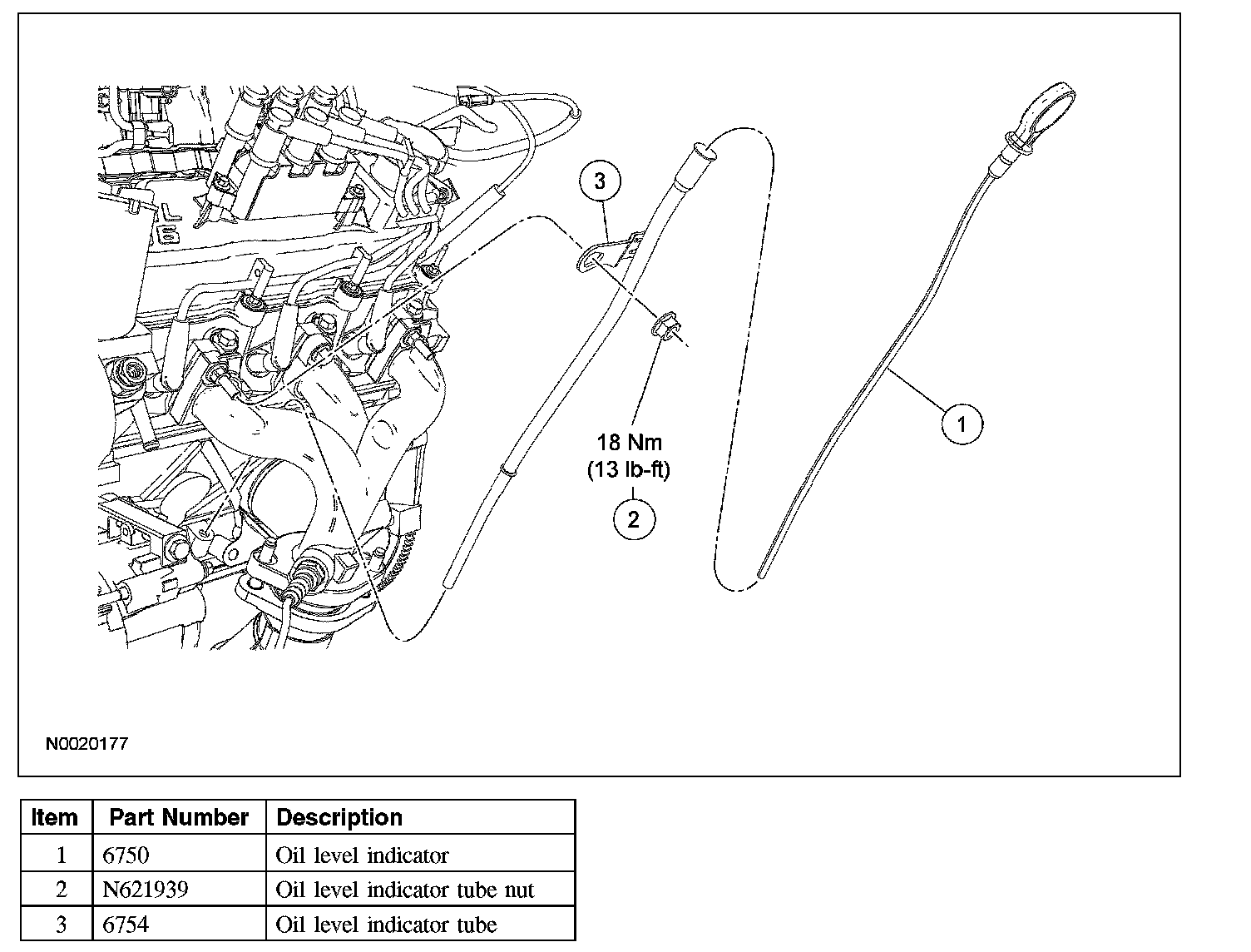 2. Install the oil level indicator tube and nut.