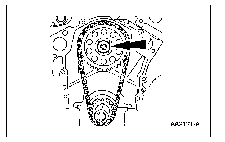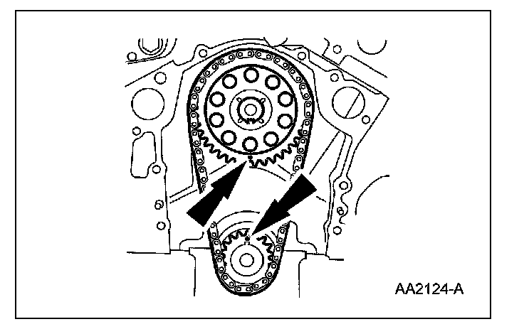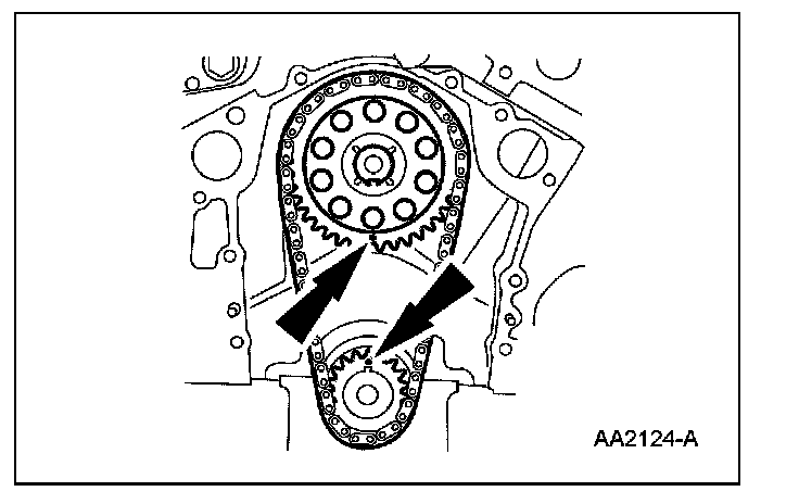12. Install the timing chain, the camshaft sprocket and the crankshaft sprocket as an assembly with the timing marks aligned.