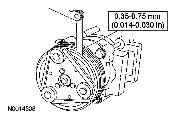 9. Measure and adjust the clutch air gap by removing or adding A/C clutch hub spacers.