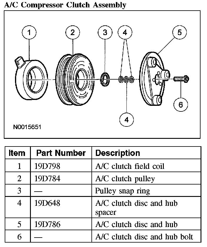 - When battery positive voltage (B+) is applied to the A/C clutch field coil, the clutch disc and hub assembly is drawn toward the A/C clutch pulley.
