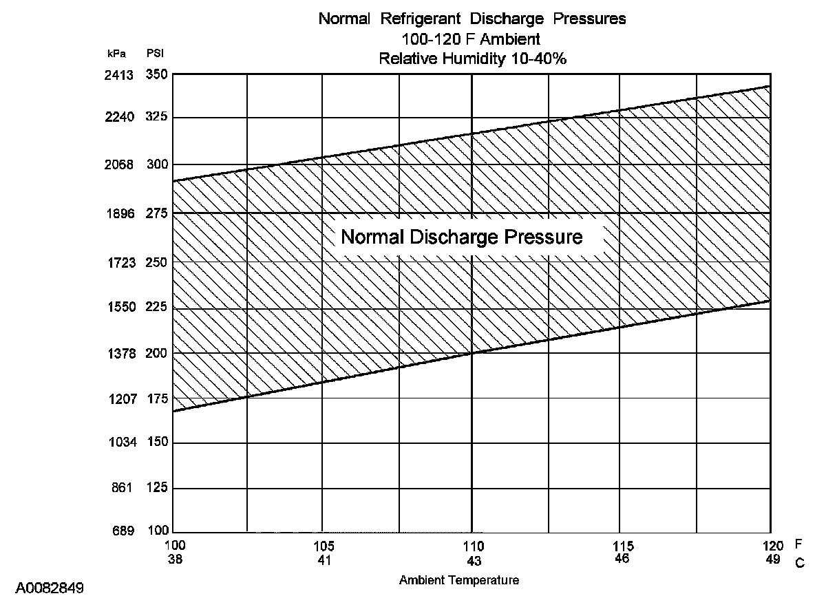 8. Determine if the discharge pressure falls within the normal operating limits using the Normal Refrigerant Discharge Pressures chart.