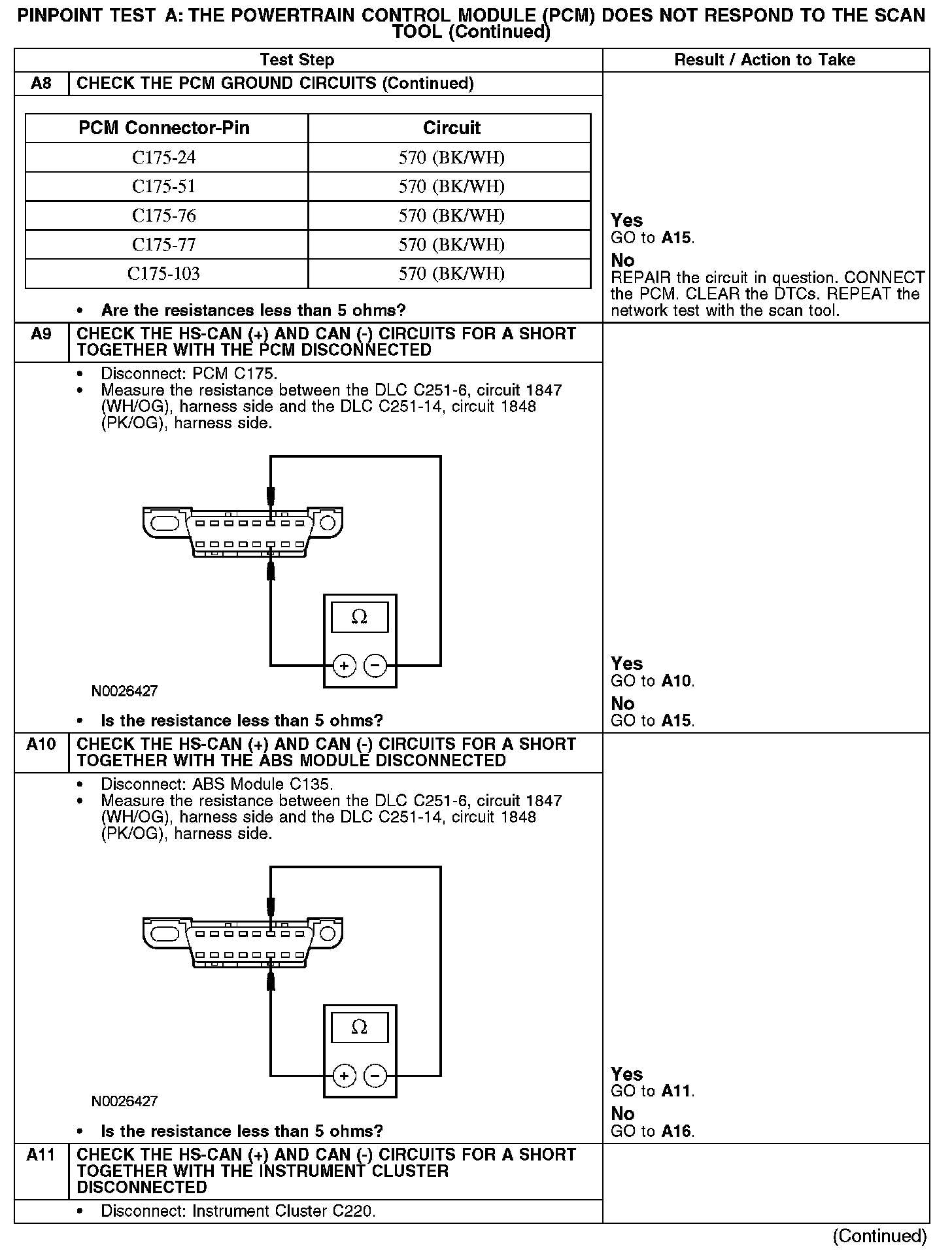 The PCM communicates with the scan tool through the high speed controller area network (HS-CAN), circuits 1847 (WH/OG) and 1848 (PK/OG). The PCM shares the HS-CAN with the anti-lock brake system (ABS) module and the instrument cluster. Circuit 883 (PK/LB) provides voltage, and circuit 570 (BK/WH) provides ground.