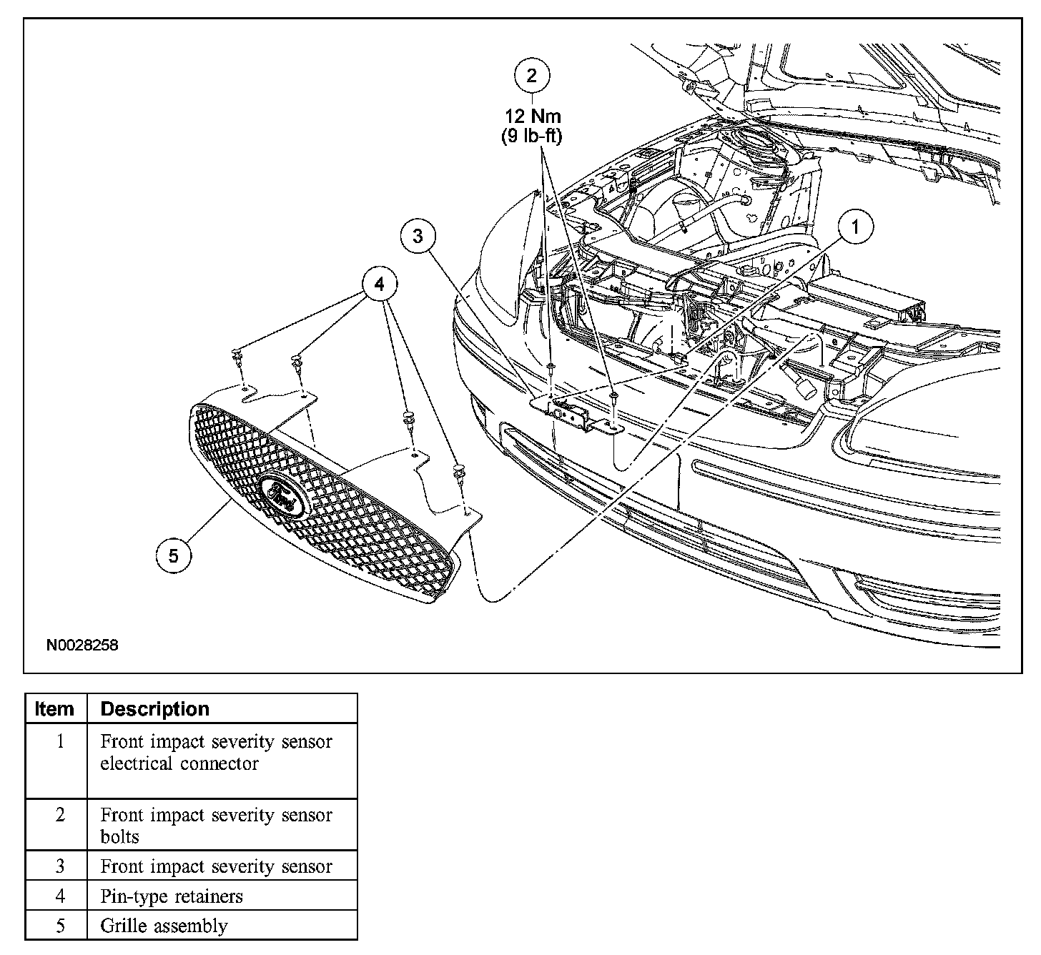 3. WARNING: The tightening torque of the air bag front impact severity sensor retaining bolt is critical for correct system operation.