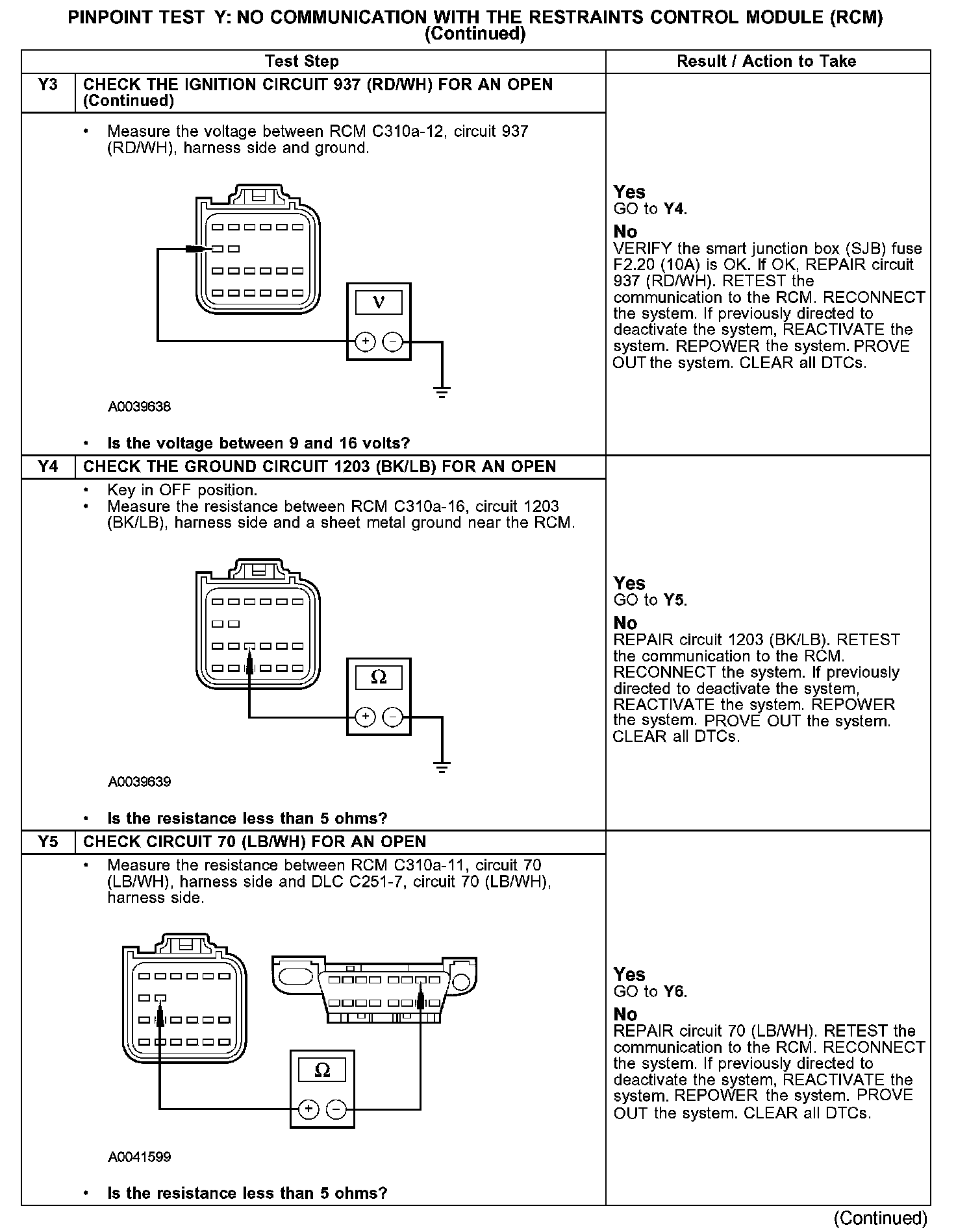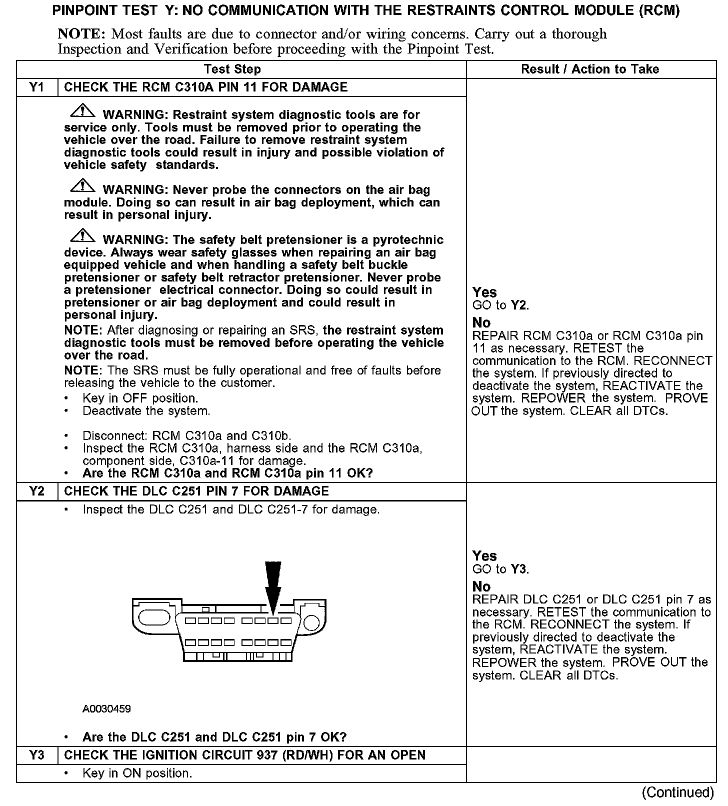 PINPOINT TEST Y: NO COMMUNICATION WITH THE RESTRAINTS CONTROL MODULE (RCM)Y1-Y3: