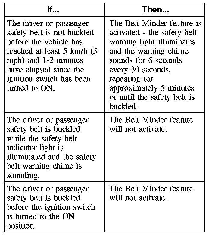 The safety belt warning indicator illuminates and a chime sounds to remind the occupants to fasten their safety belts.
