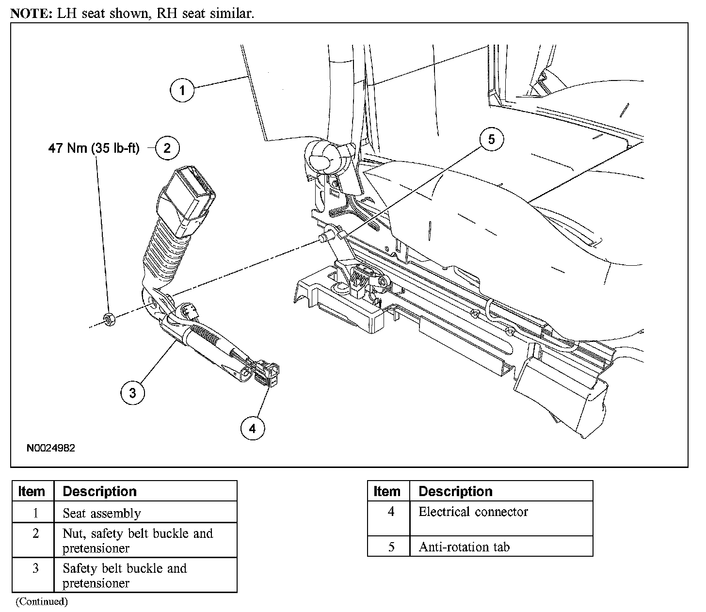 - Align the safety belt buckle and pretensioner mounting bracket slot so that the seat track bracket anti-rotation tab goes through it.