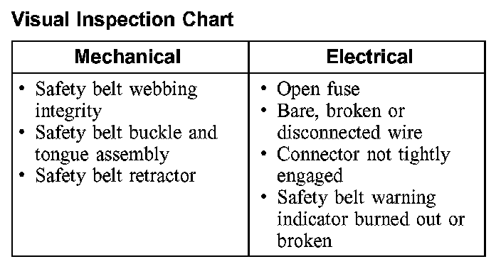 3. If the inspection reveals an obvious concern(s) that can be readily identified, service as required. With the exception of removing a twist from the safety belt webbing, do not attempt to repair a component of the safety belt system; new components must be installed.