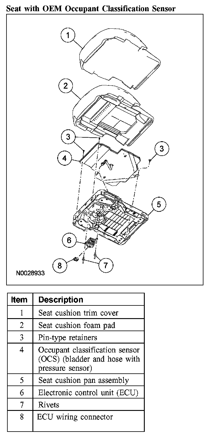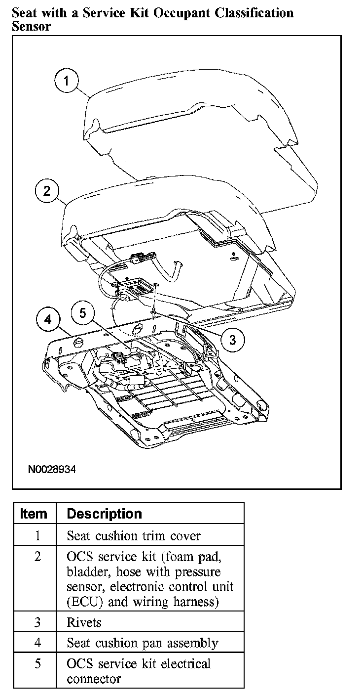 - The OCS system components (seat cushion foam pad, bladder with pressure sensor and electronic control unit) are calibrated to each other and are serviced as an assembly. The OCS system components are not to be installed separately. If a new OCS system, OCS system component or seat cushion foam pad are needed, a new OCS system service kit (seat cushion foam pad, bladder with pressure sensor and electronic control unit) must be installed as an assembly.
