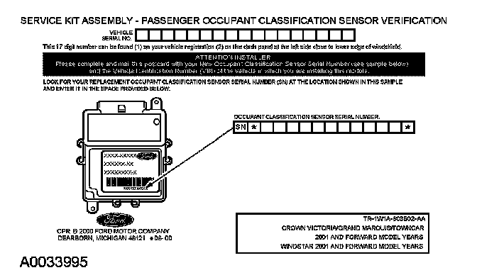 If a new OCS was installed, fill out the necessary information on the OCS traceability card and return it along with the complete inoperative occupant classification sensor to Ford Motor Company.