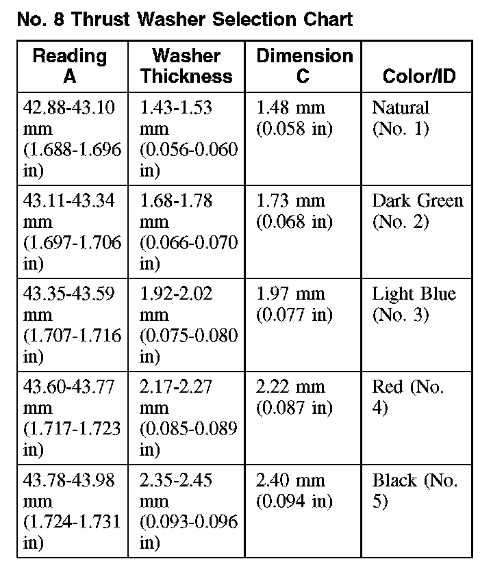Use reading A to select the correct No. 8 thrust washer from the chart.