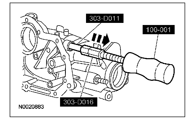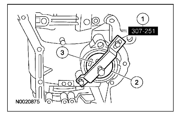 Position the special tool into the case and install the hook end of tool into one of the lube holes in the front sun shell. Position the block over the edge of the assembly and tighten the handle.