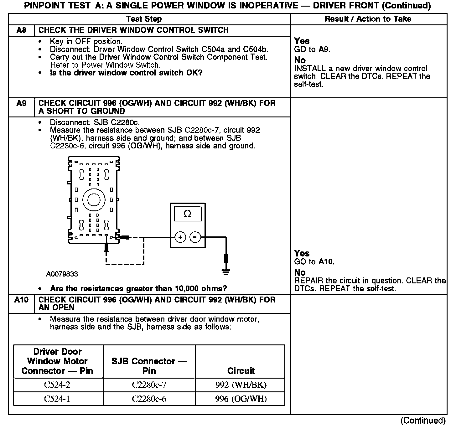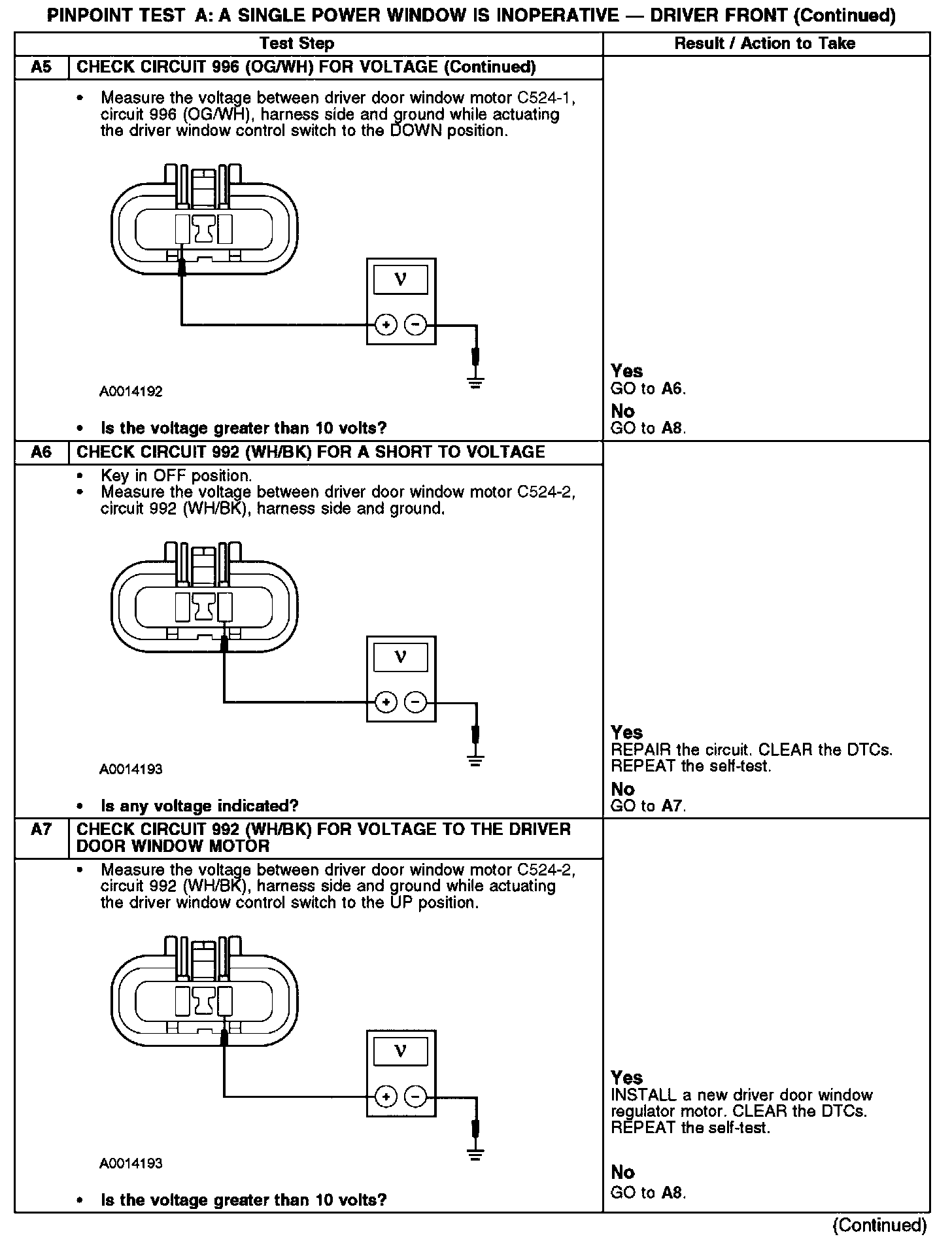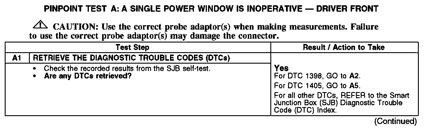 PINPOINT TEST A: A SINGLE POWER WINDOW IS INOPERATIVE DRIVER FRONTA1: