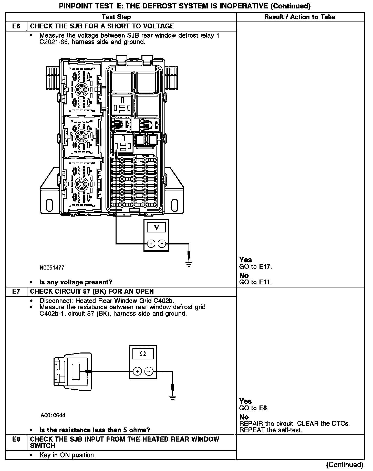 The smart junction box (SJB) generates a voltage signal to the rear window defrost switch through circuit 1010 (DB/OG). The rear window defrost switch is grounded through circuit 651 (BK/YE). When the switch is engaged and the ignition switch is in the RUN position, the SJB supplies a ground signal and activates the rear window defrost relay 1. This supplies voltage to the relay center box 1 on circuit 186 (BN/LB) and activates rear window defrost relay 2. The rear window defrost relay 2 provides voltage to the rear window defrost grid on circuit 185 (BK). The rear window defrost grid is grounded through circuit 57 (BK). The SJB maintains the ground signal for 10 minutes or until the switch is selected OFF or the ignition switch is turned to OFF or ACC.