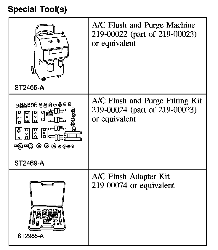 - Only the A/C Flush and Purge Machine Kit 219-00023, which includes A/C Flush and Purge Machine 219-00022, A/C Flush and Purge Fitting Kit 219-00024 and A/C Systems Flushing Solvent, is approved for use on Ford vehicles. No other flushing device or solvent is approved for flushing heat exchangers (air conditioning [A/C] condenser, A/C evaporator). Use of any other flusher or solvent may cause damage to the A/C system and the flushing unit.