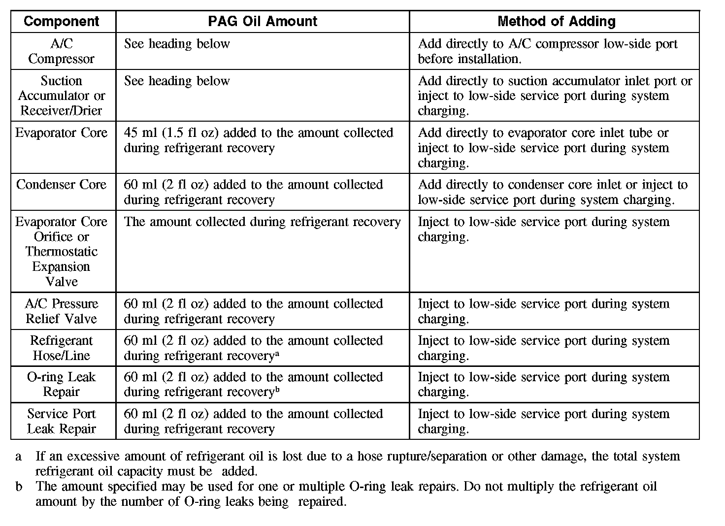 NOTE: During normal A/C operation, oil is circulated through the system with the refrigerant, and a small amount is retained in each component. If certain components of the system are removed, some of the refrigerant oil will go with the component. To maintain the original total oil charge, it is necessary to compensate for the oil lost by adding oil to the system with the new part.