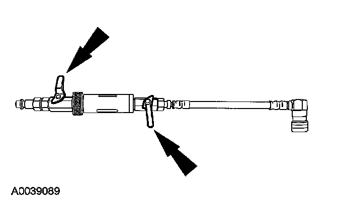 5. Install the dye/lubricant injector between the low-side service gauge port valve and the refrigerant service station or manifold gauge set.