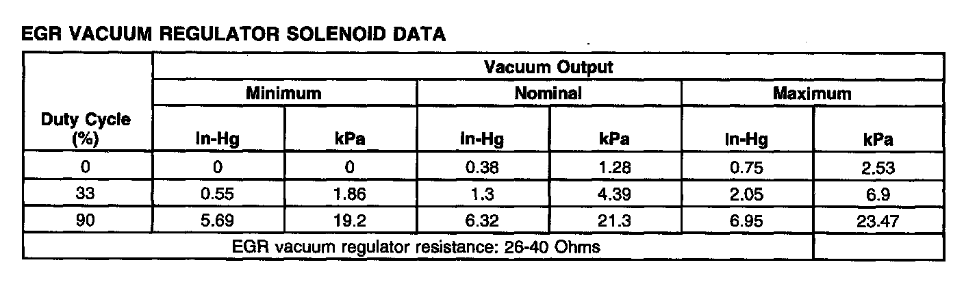The EGR vacuum regulator solenoid is an electromagnetic device used to regulate the vacuum supply to the EGR valve. The solenoid contains a coil which magnetically controls the position of a disc to regulate the vacuum. As the duty cycle to the coil increases, the vacuum signal passed through the solenoid to the EGR valve also increases. Vacuum not directed to the EGR valve is vented through the solenoid vent to atmosphere. Note that at 0% duty cycle (no electrical signal applied), the EGR vacuum regulator solenoid allows some vacuum to pass, but not enough to open the EGR valve.