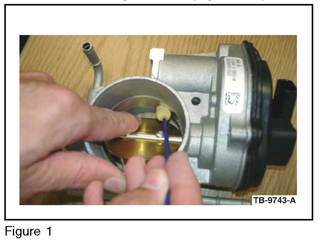 7. Using Motorcraft(R) Choke and Linkage Cleaner or equivalent, spray the throttle body plate and bore. Using a small, soft, solvent resistant brush, clean the edges of the throttle plate and the mating surface of the throttle bore to remove all engine deposit build up. Reapply choke and linkage cleaner. (Figures 1-2)