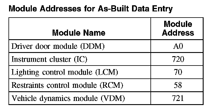 As-Built data is a VIN specific module configuration record. During vehicle build, the configuration from all modules is downloaded and stored in the As-Built database. As-Built data will not reflect customer preference items that have been changed from the default state. These items will need to be changed using programmable parameters after the module is configured.