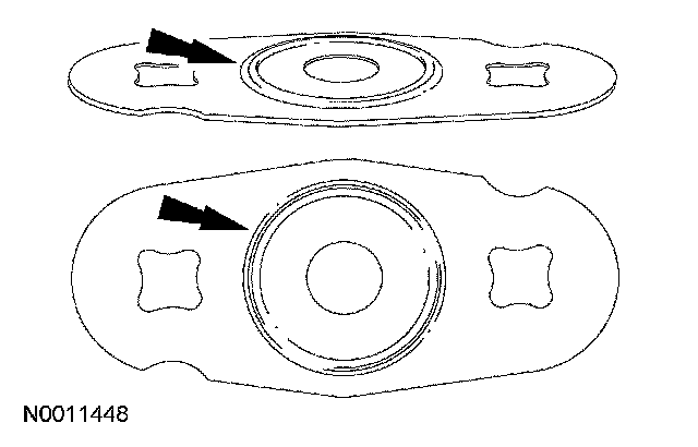 - Install a new EGR system module gasket with the side that has the raised circle facing the intake manifold.