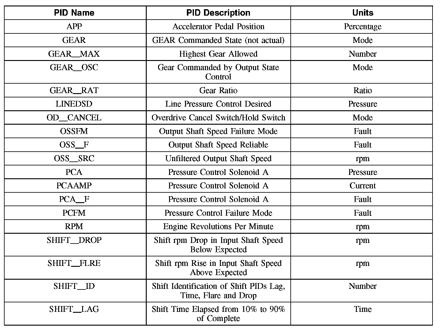 To confirm that the OSC command was sent by the scan tool and the PCM has accepted the OSC command, a corresponding PID for each OSC parameter must be monitored. After sending the OSC command, the corresponding PID value should be the same as the OSC command. Additional PIDs should be monitored to help the technician accurately diagnose the transmission.