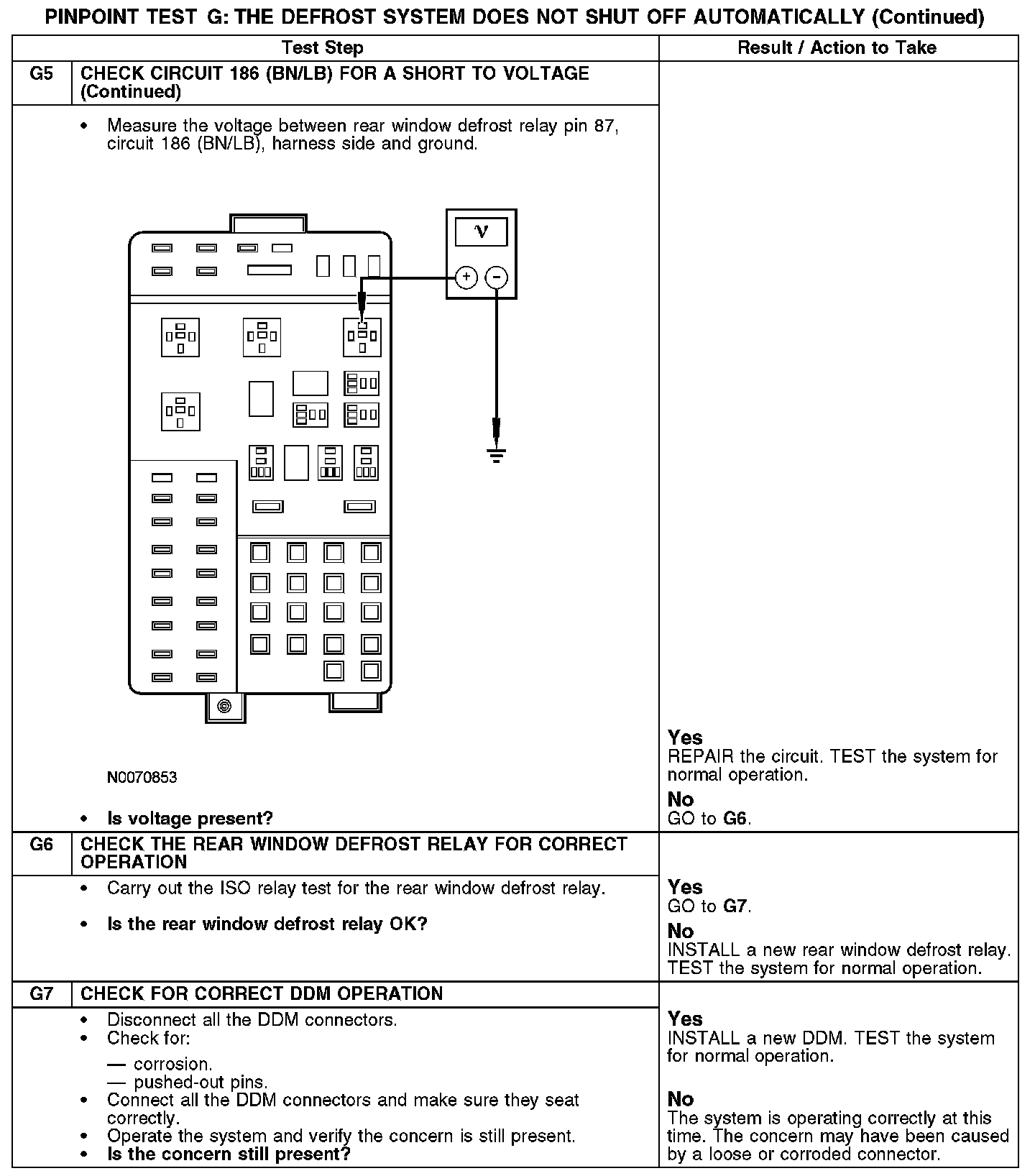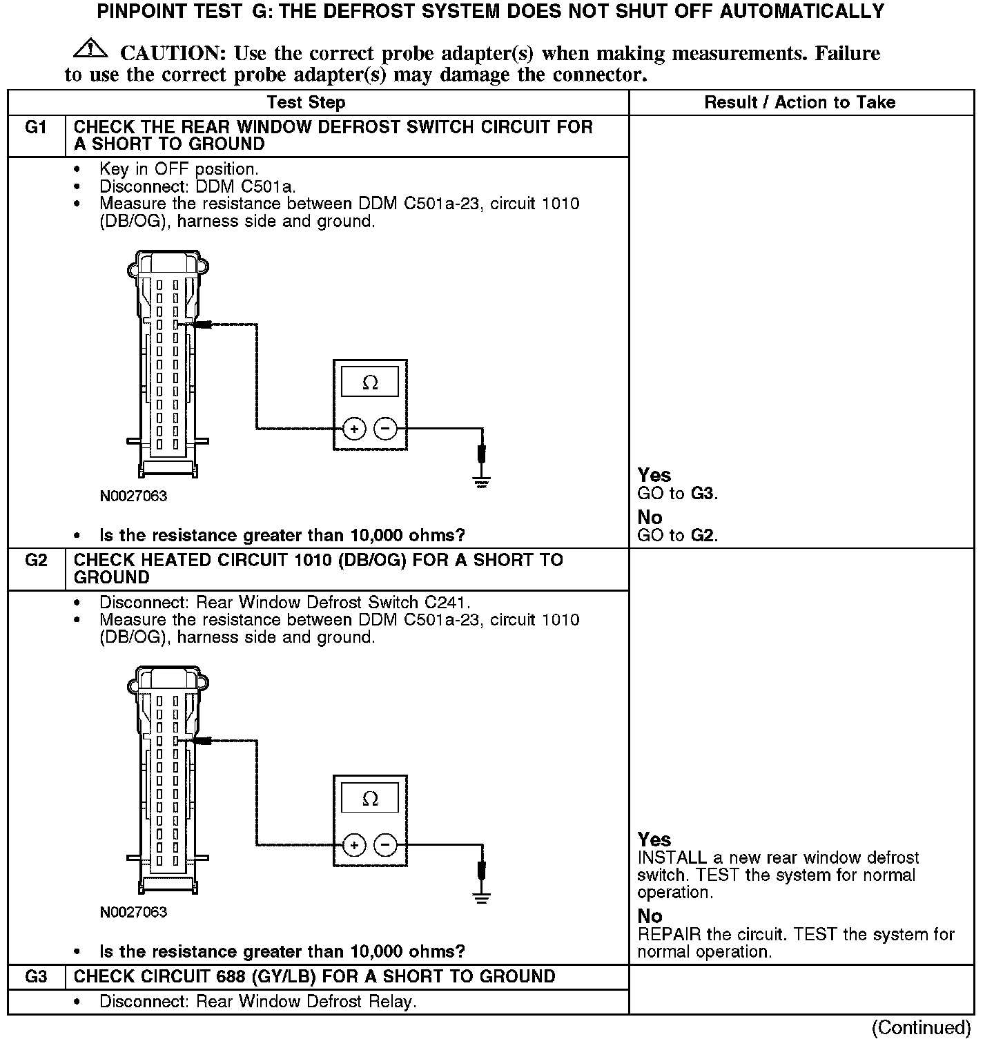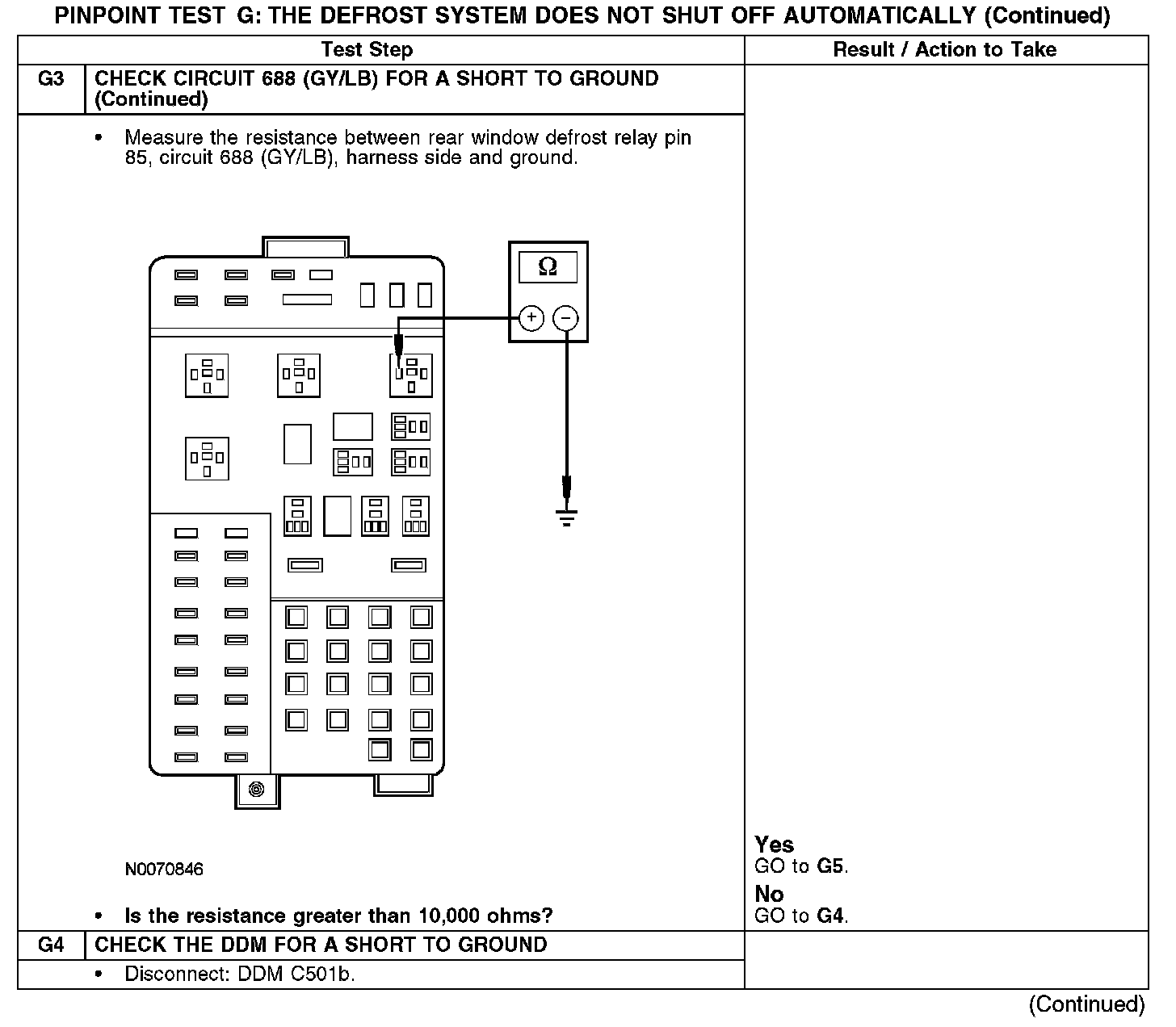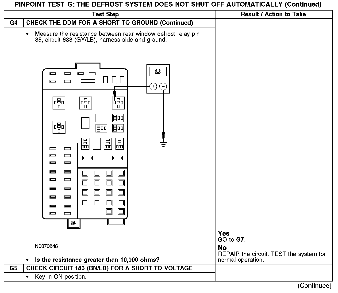 The key must be in the START or RUN position for the heated rear window to operate. When the rear window defrost switch is pressed, a momentary ground is supplied to the driver's door module (DDM) through circuit 1010 (DB/OG). The DDM provides a ground for the rear window defrost relay coil on circuit 688 (GY/LB). When the rear window defrost relay coil is energized, the relay switch closes, providing voltage to the heated rear window grid, the heated rear window indicator, and the heated exterior mirror (if equipped) through circuit 186 (BN/LB). The heated rear window grid and the rear window defrost switch are grounded through circuit 57 (BK).