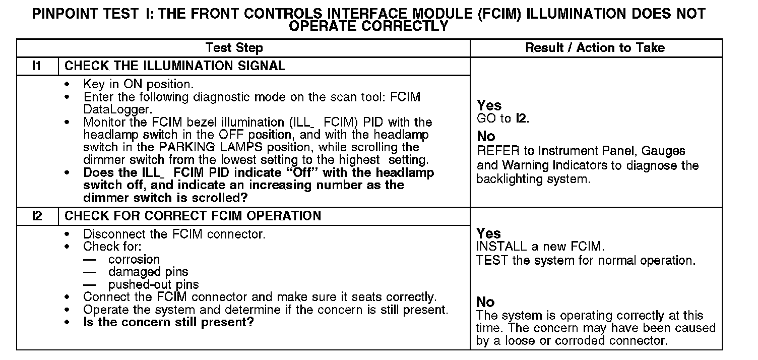 Test I: The Front Controls Interface Module (FCIM) Illumination Does Not Operate Correctly