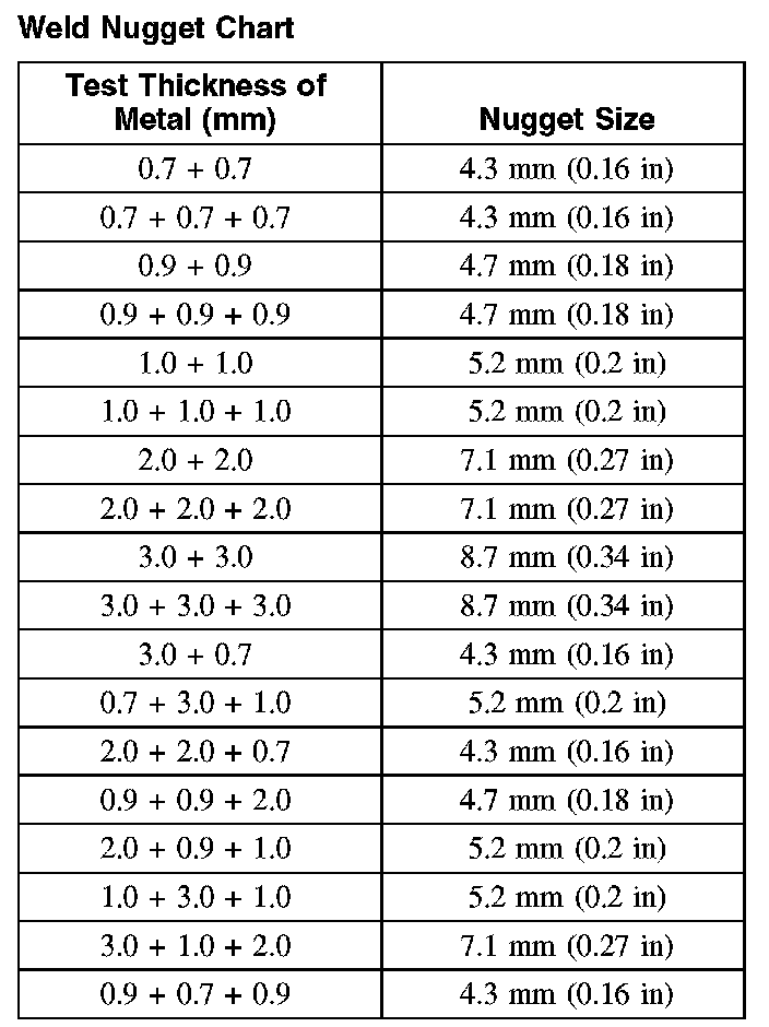 - Factory spot welds may be substituted with either STRW or MIG plug welds. Spot/plug welds should equal factory welds in both location and quantity. Do not place a new spot weld directly over an original weld location. Plug weld hole should equal 8 mm (0.31 in) diameter.