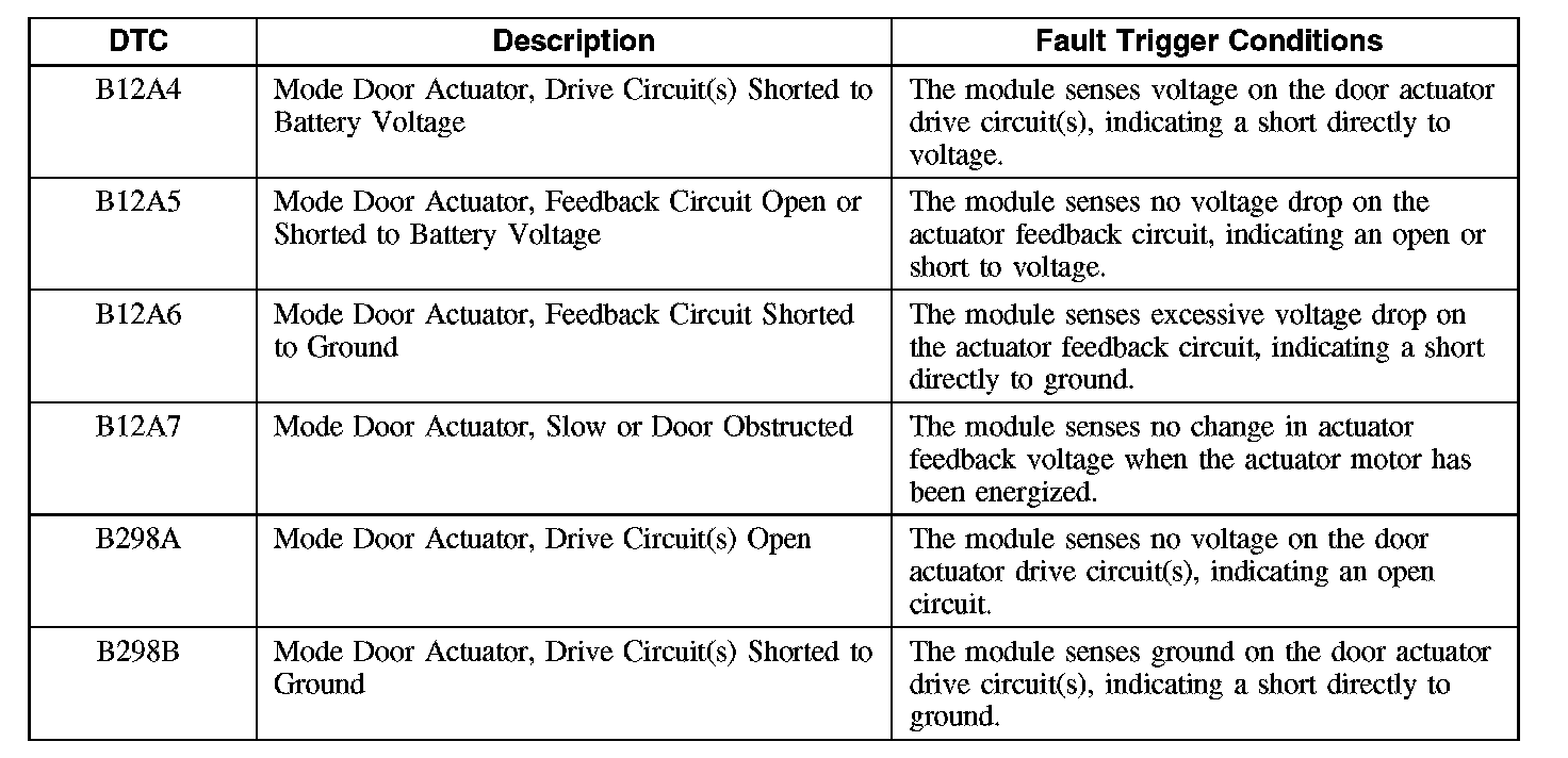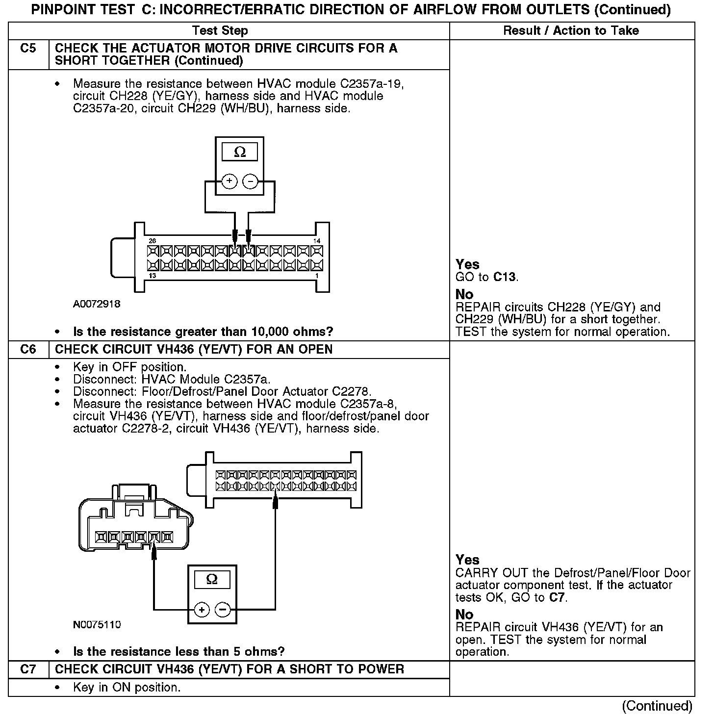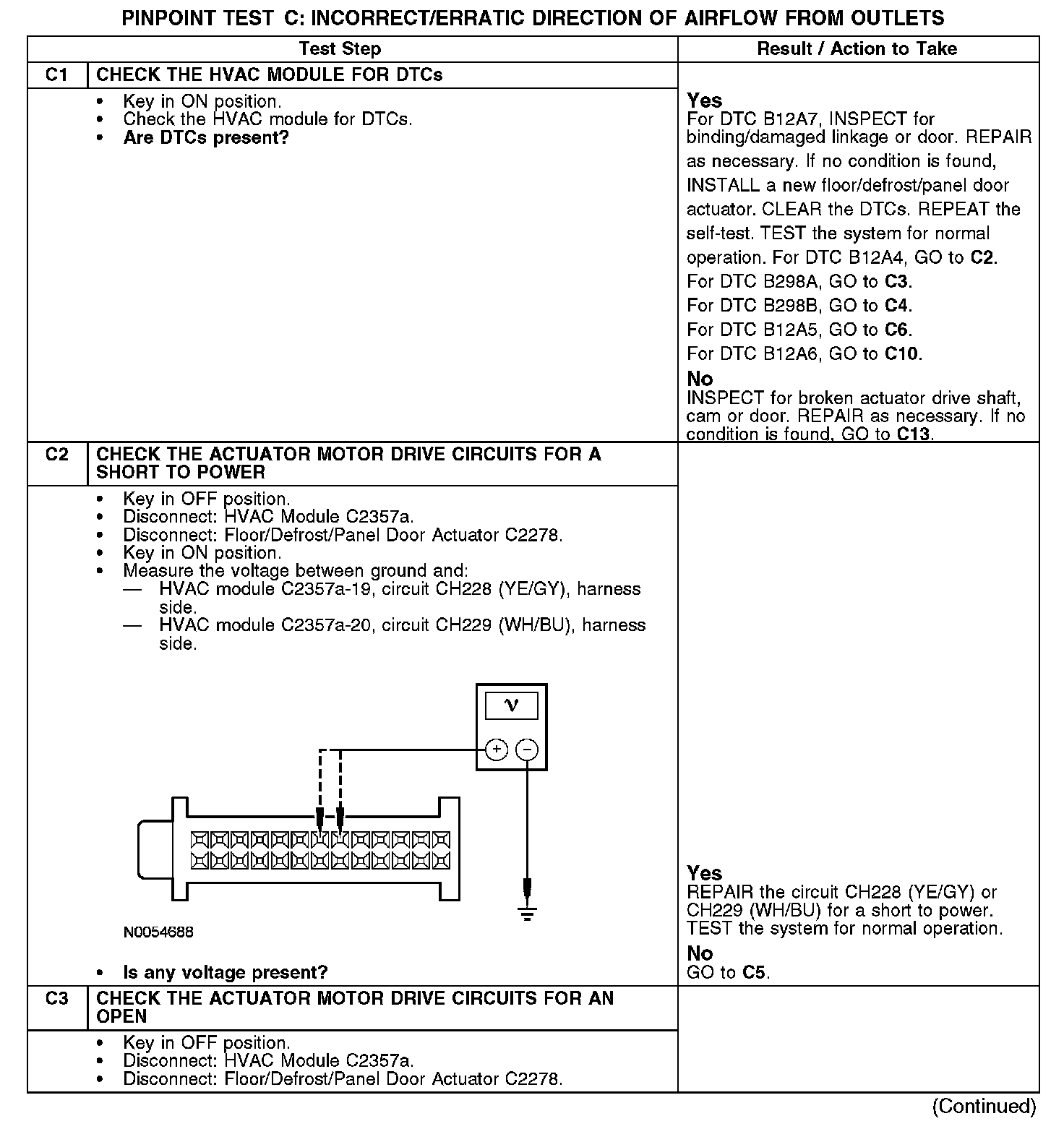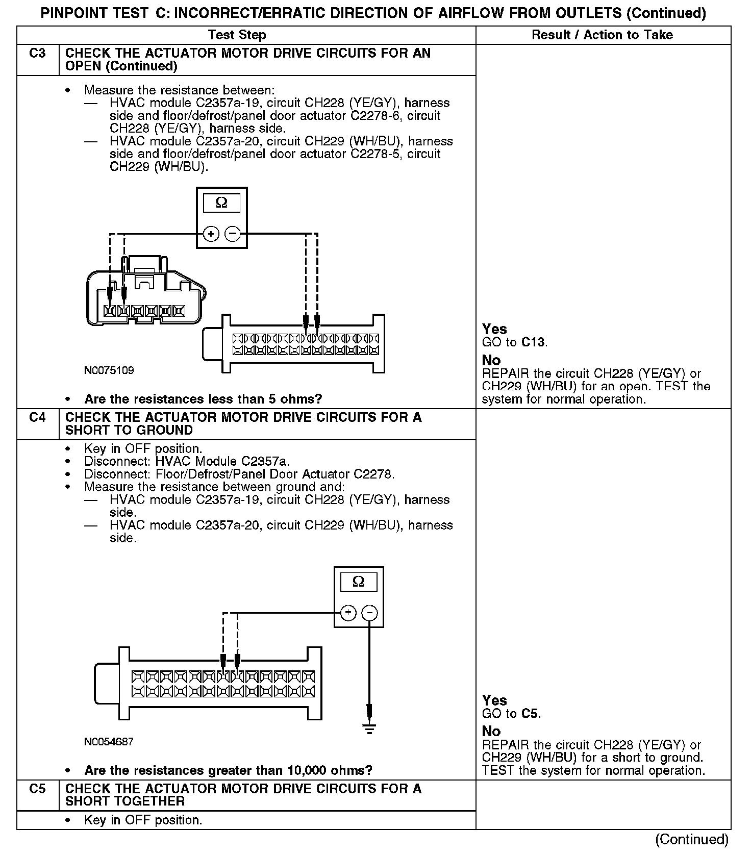 Under normal operation, to rotate the mode door actuator clockwise, the HVAC supplies voltage to the floor/defrost/panel mode door actuator motor through the circuit CH228 (YE/GY), and supplies ground through circuit CH229 (WH/BU). To rotate the mode door actuator counterclockwise, the HVAC module reverses the voltage and ground circuits.