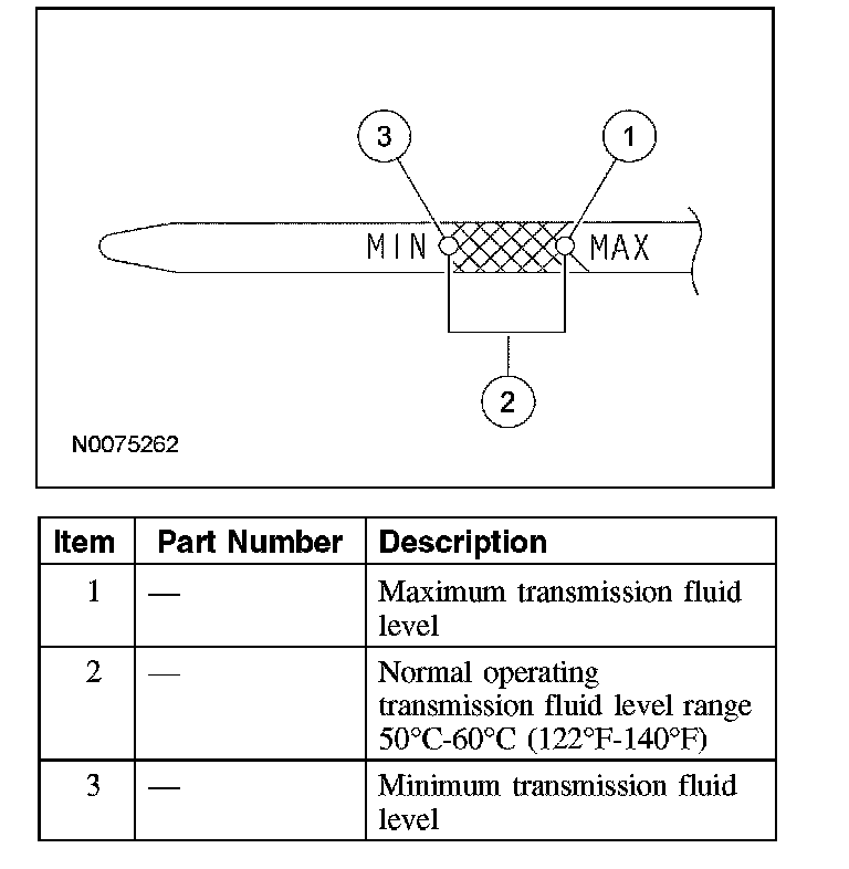 NOTE: Transmission fluid expands when warmed. To obtain an accurate transmission fluid level check, drive the vehicle until normal operating temperature is reached, approximately 30 km (20 mi).