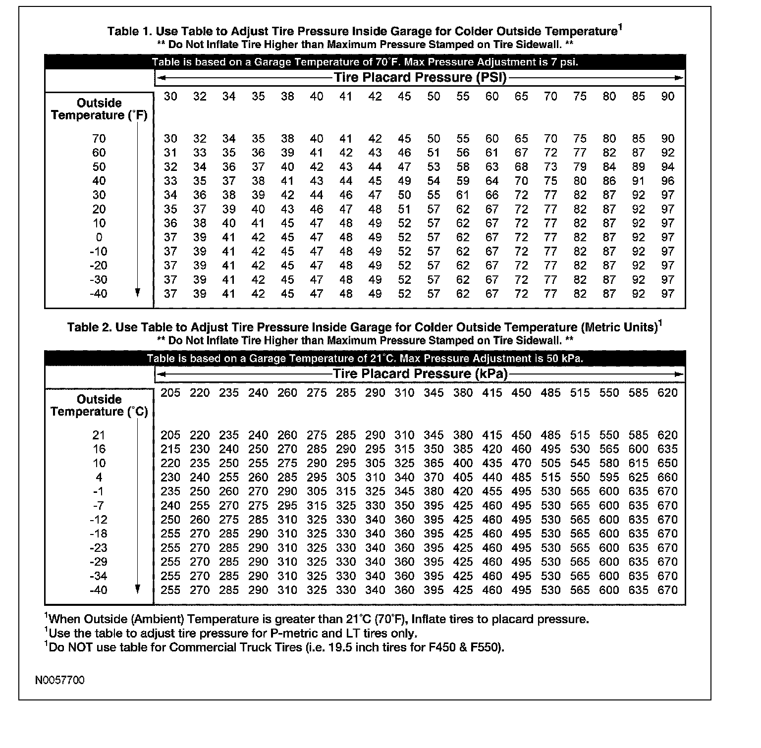 As the ambient temperature decreases by 6° C (10° F), tire pressure decreases 7 kPa (1 psi). Adjust the tire pressure by 7 kPa (1 psi) for each 6° C (10° F) ambient temperature drop as necessary to keep the tire at the specified vehicle certification label pressure. Refer to the tire pressure tables to adjust the tire pressure indoors for colder outside temperatures.