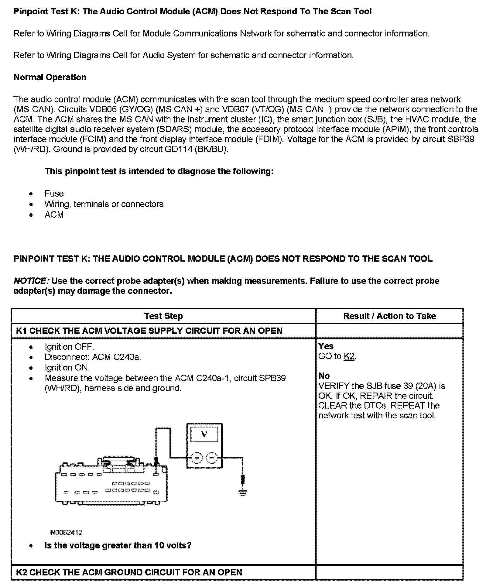 Pinpoint Test K: The Audio Control Module (ACM) Does Not Respond To The Scan Tool