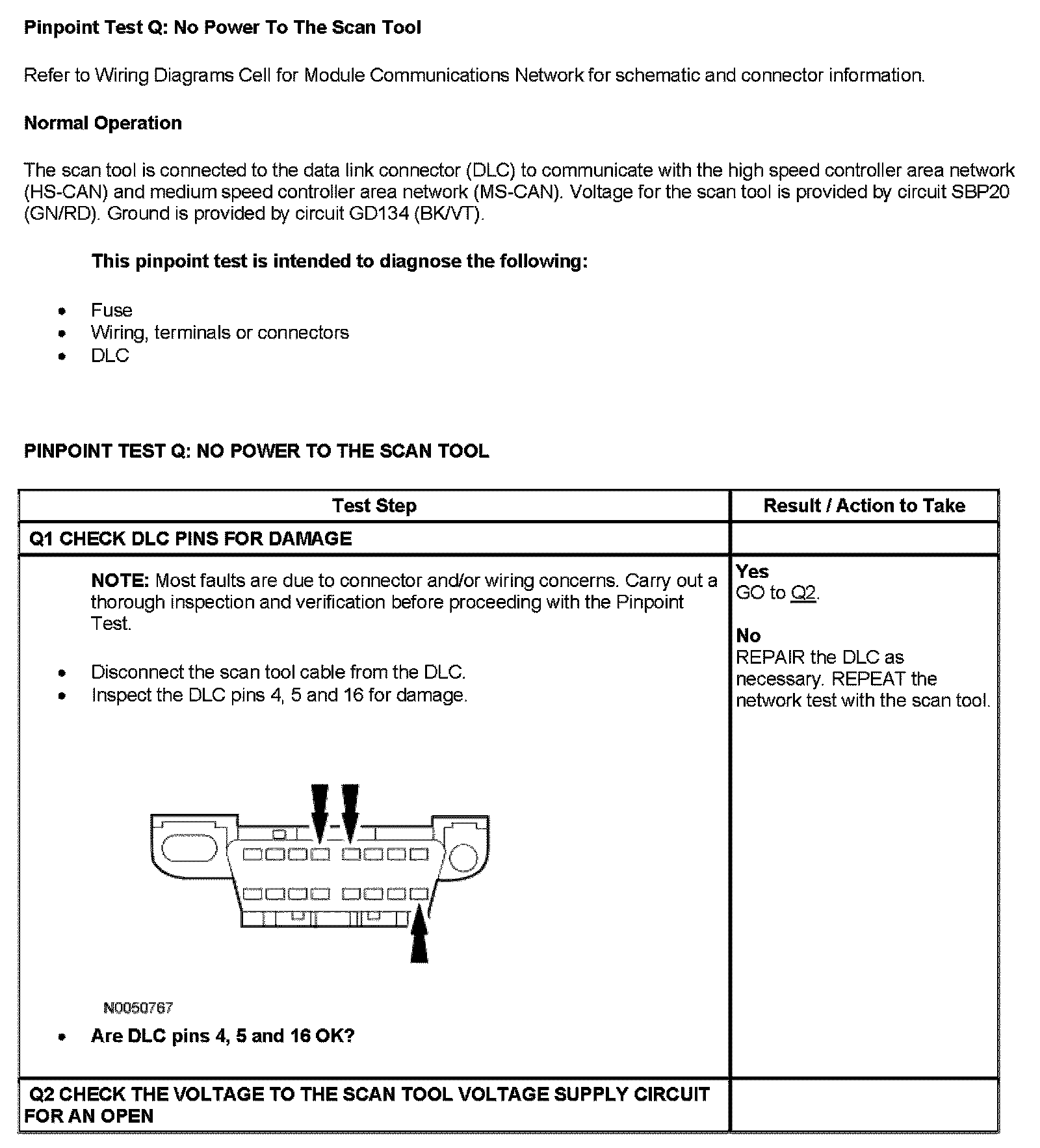 Pinpoint Test Q: No Power To The Scan Tool