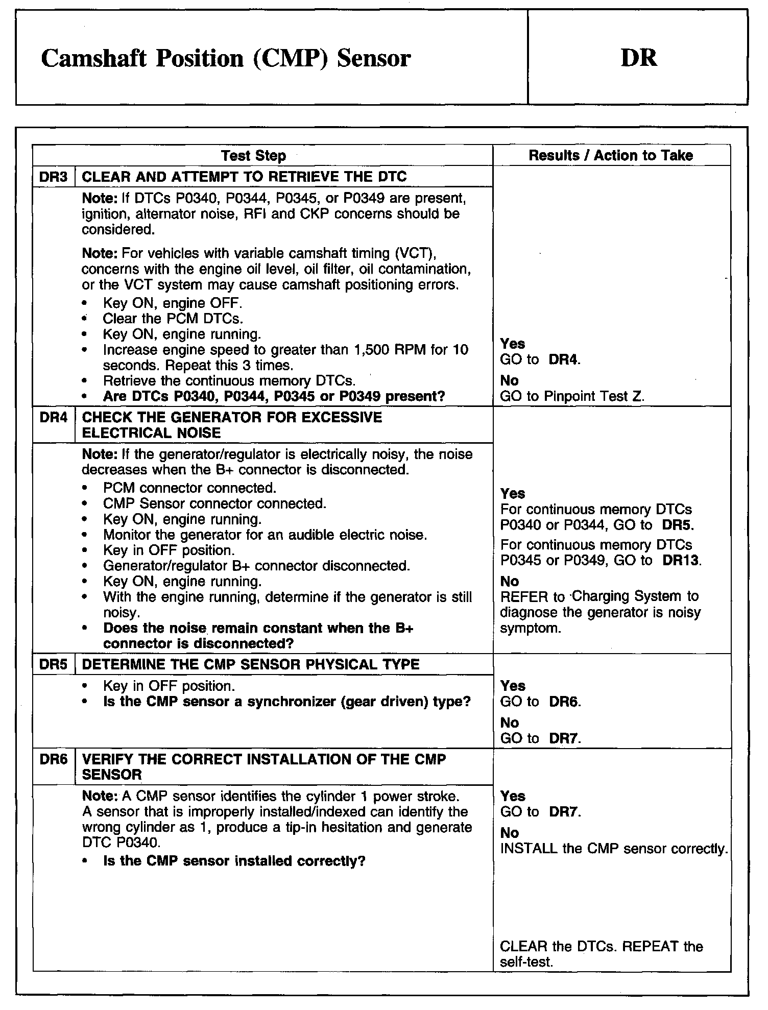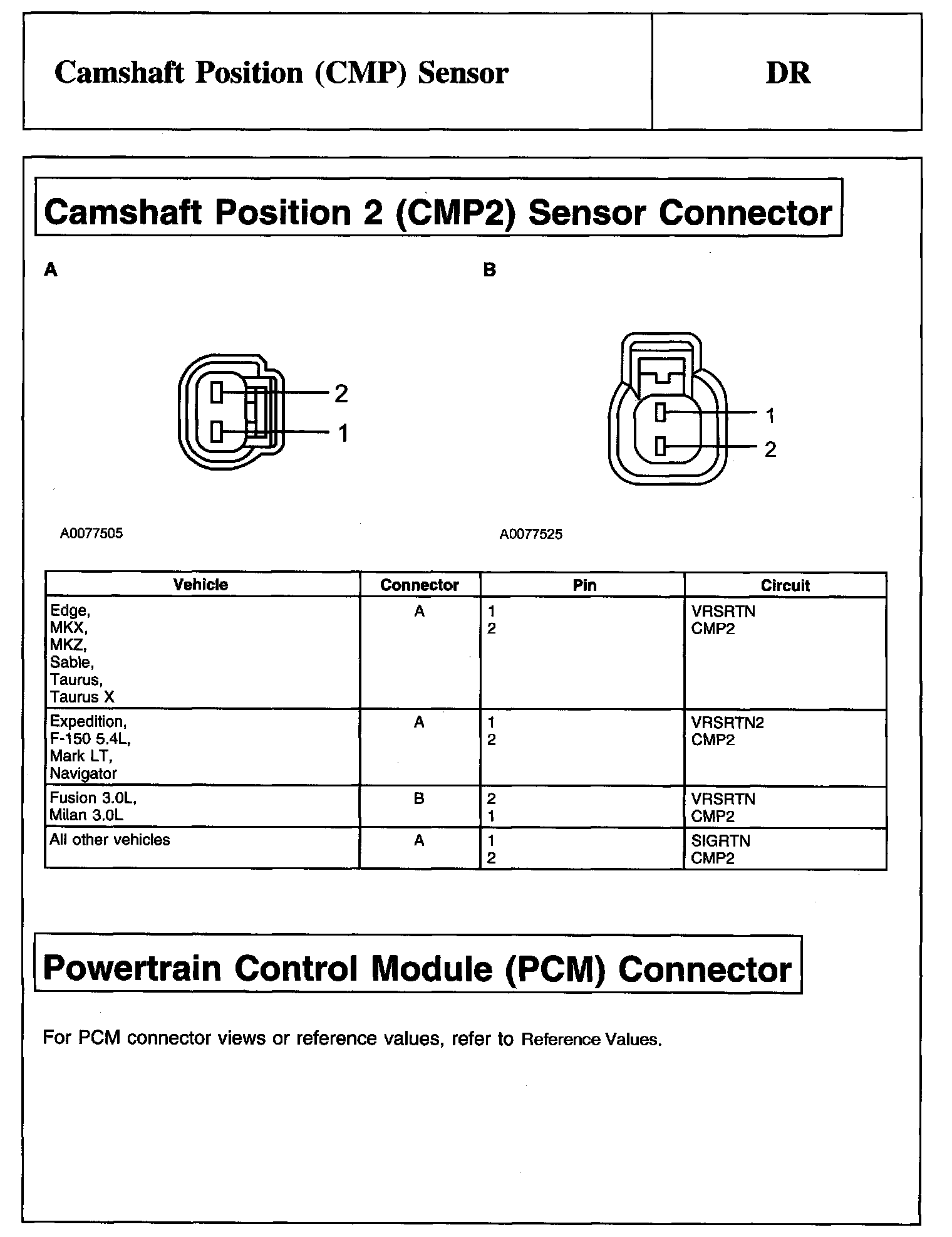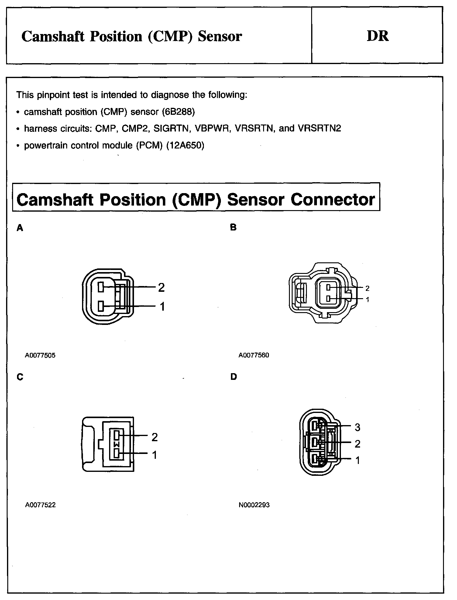 PINPOINT TEST DR: CAMSHAFT POSITION (CMP) SENSORDescription And Camshaft Position (CMP) Sensor Connector: