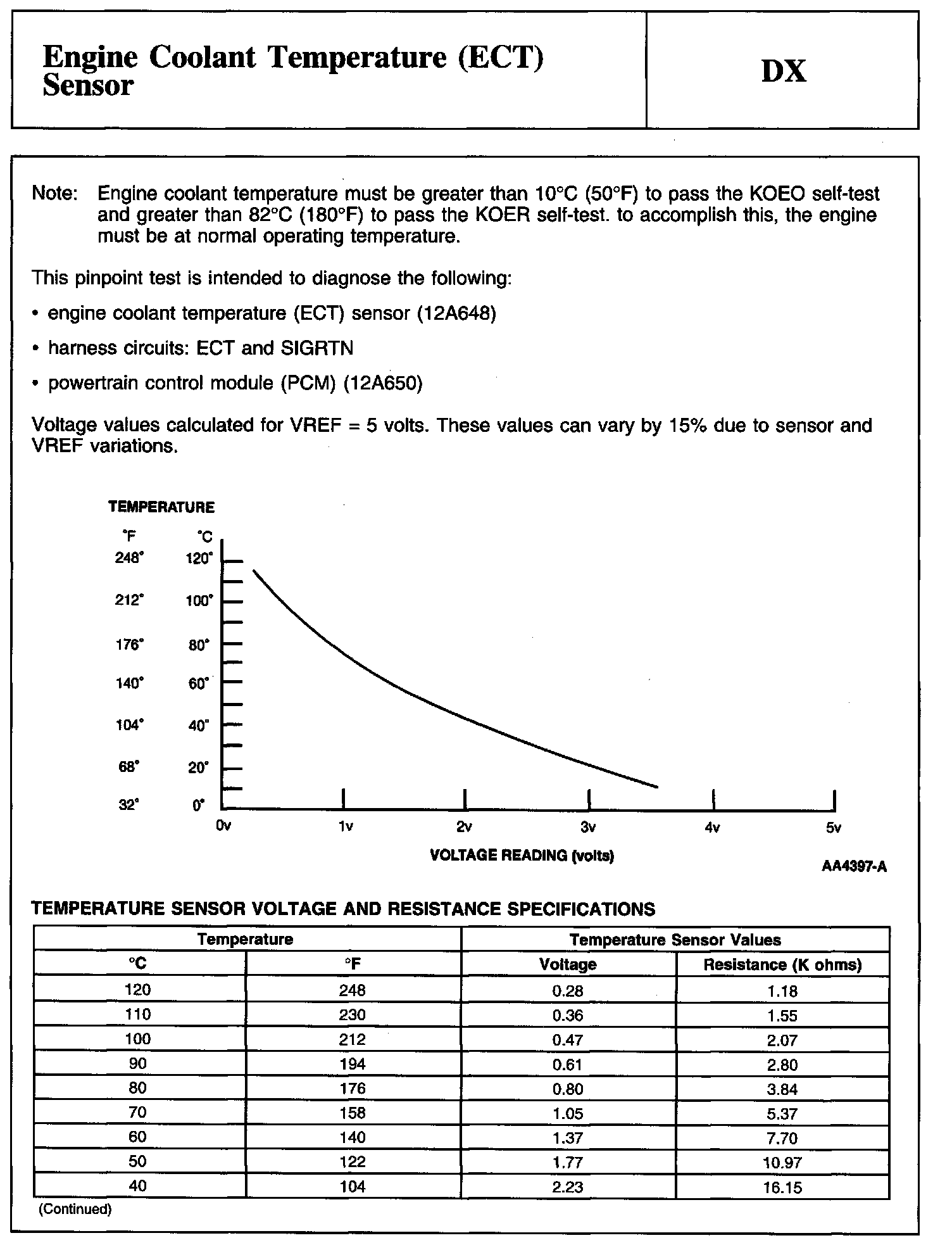 PINPOINT TEST DX: ENGINE COOLANT TEMPERATURE (ECT) SENSORNote, Graph And Temperature Sensor Voltage And Resistance Specifications: