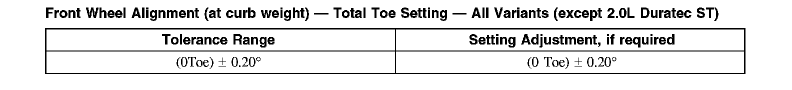 Front Wheel Alignment (at curb weight) - Total Toe Setting - All Variants (except 2.0L Duratec ST)