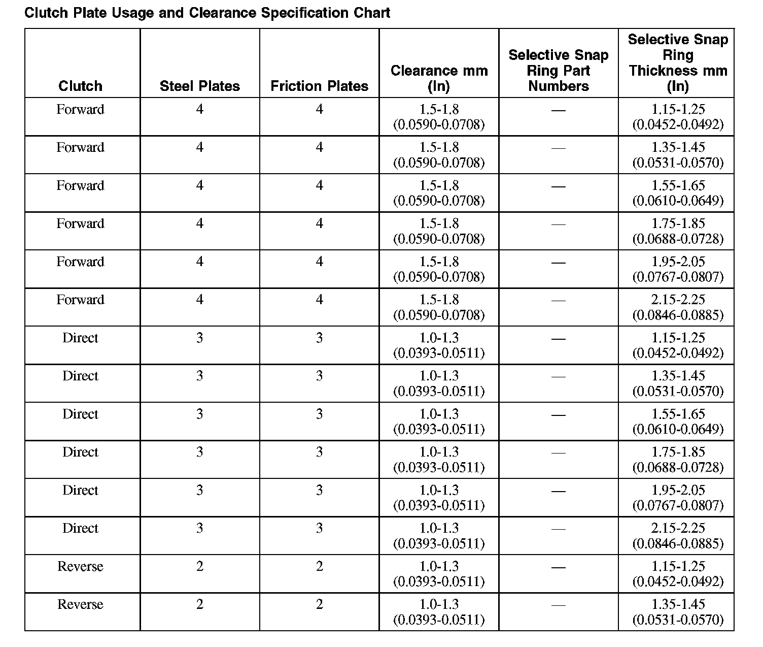 Clutch Plate Usage and Clearance Specification Chart