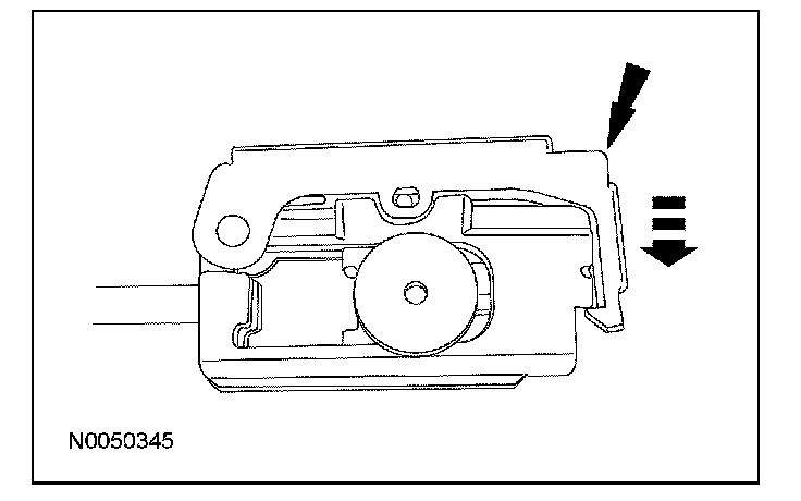 6. NOTE: When installing the selector lever cable, make sure that the selector lever cable locking tabs are locked in place and the selector lever cable end is snapped onto the ball stud. Press the selector lever cable into the selector lever cable bracket and listen for the selector lever cable to click in place. Pull back on the selector lever cable to make sure that it is locked into the selector lever cable bracket. Also make sure that the selector lever cable end is correctly installed onto the ball stud. Pull back on the selector lever cable end to make sure that the selector lever cable end is correctly installed.