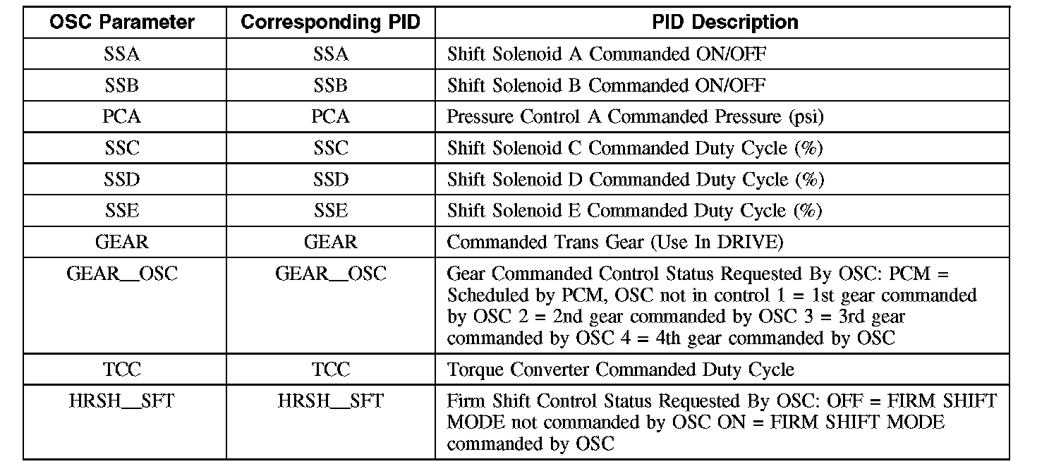 To confirm that the output state control (OSC) value was sent by the scan tool and the PCM has accepted the OSC substitution, a corresponding PID or PIDs for each OSC parameter should be monitored. Additional PIDs should be monitored to help the technician adequately diagnose the transaxle.