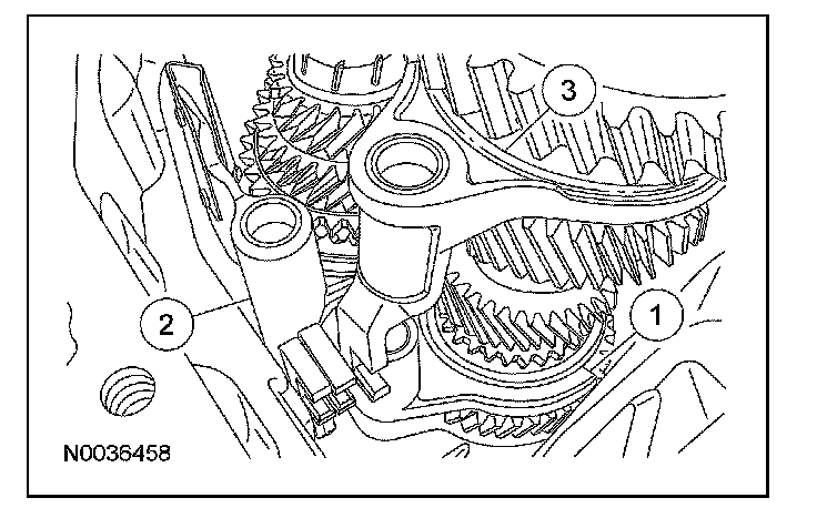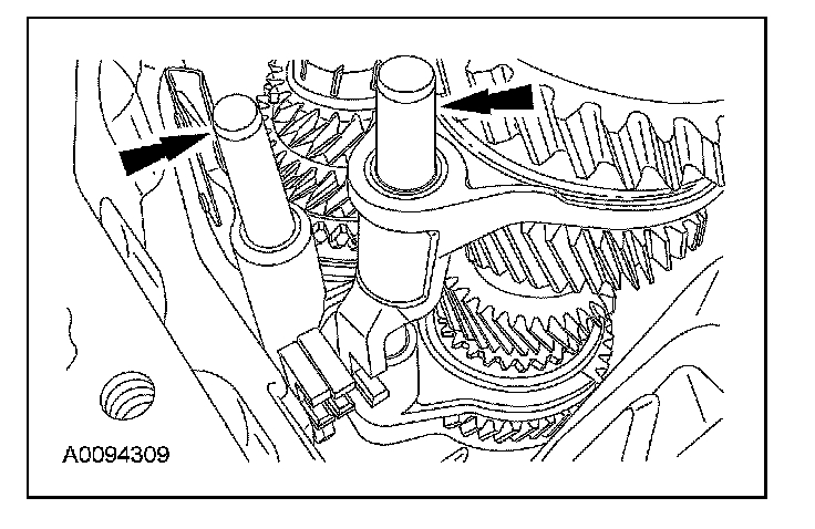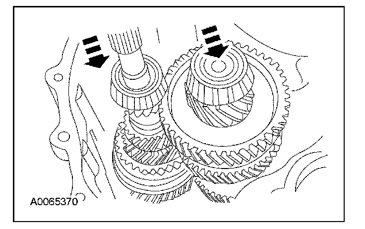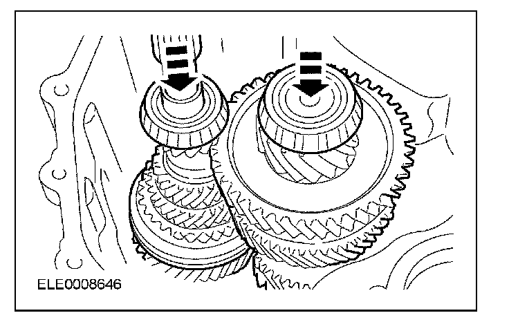 Push the reverse idler gear away from the output shaft bearing cup. Install the input shaft and the output shaft as an assembly. Position both shafts into the bearing cups and align with the reverse idler gear.