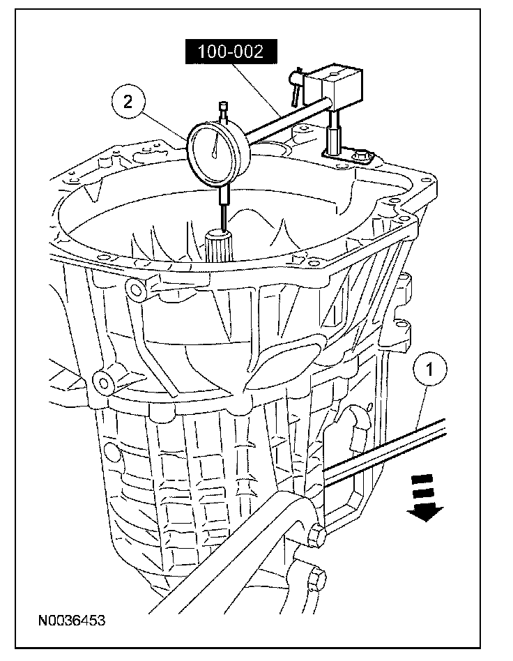18. Install the holding fixture to the transmission then install the dial indicator gauge to measure output shaft end play. Position the special tool on 4th gear. Zero the dial indicator.
