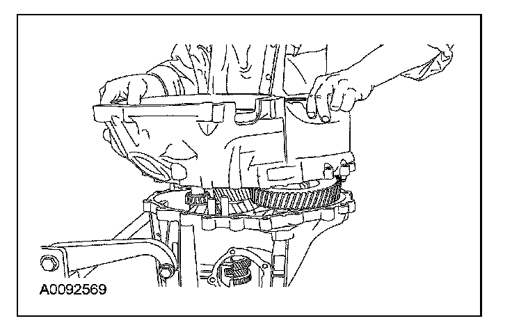 36. Clean the mating surfaces of the transaxle main case. Apply a bead of sealant to the sealing surface on the transaxle case. Install the transaxle housing.
