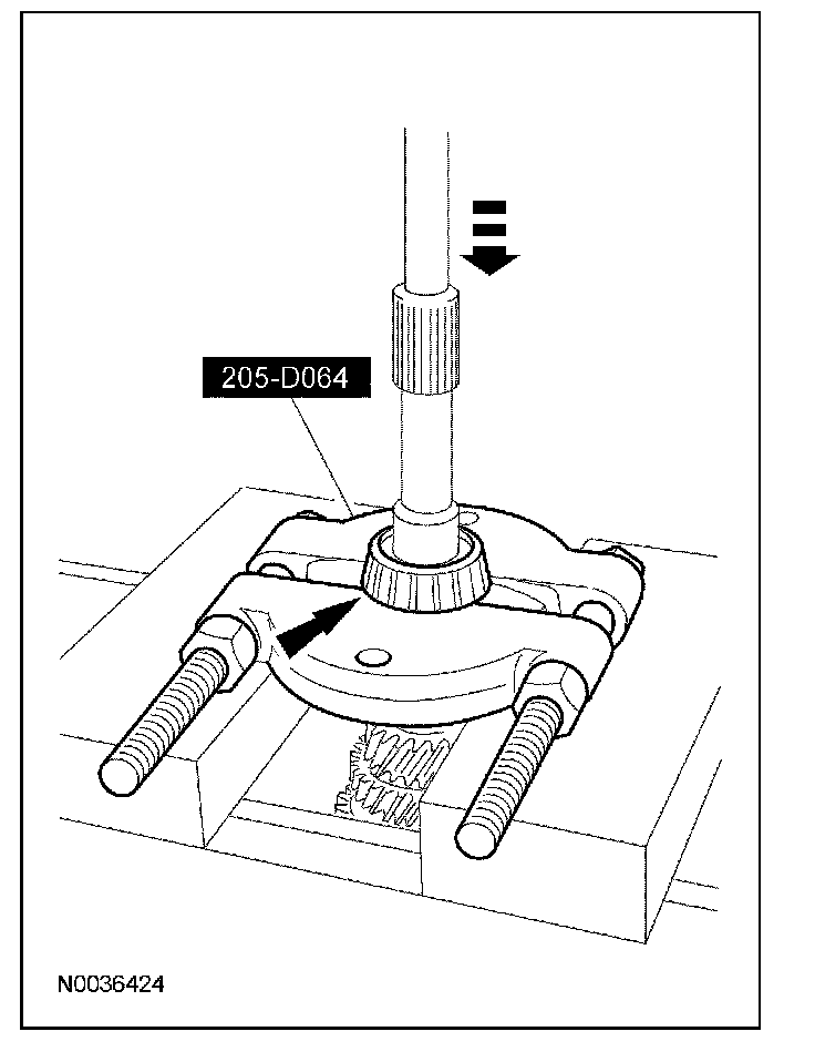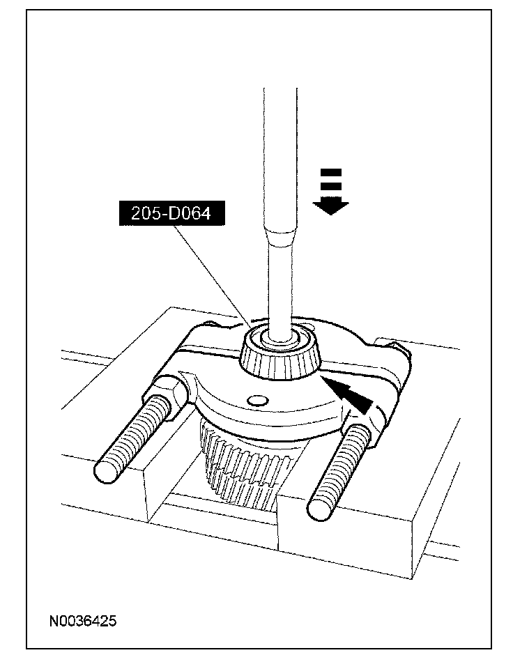 3. Using a press and the special tool, remove the snap ring and 5th gear.