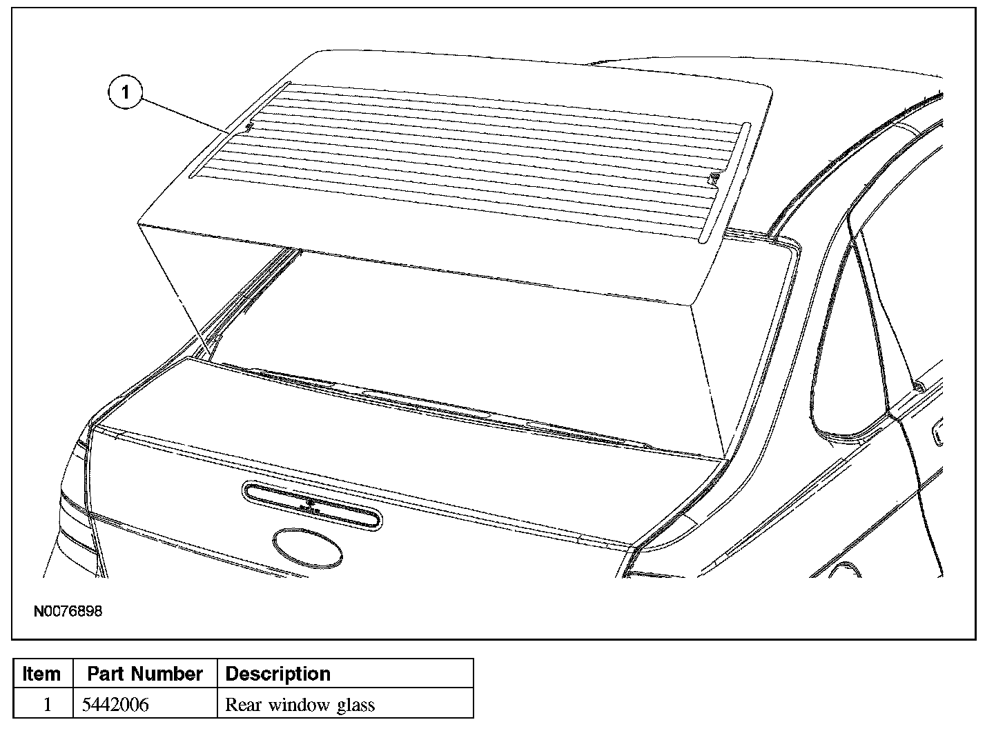 CAUTION: When installing urethane-installed glass parts, the vehicle must not be driven until the urethane has cured. Adequate cure time is specified on the drive away chart for each urethane product as the temperatures and humidity vary. Inadequate or incorrect curing can adversely affect the retention of the rear window glass.