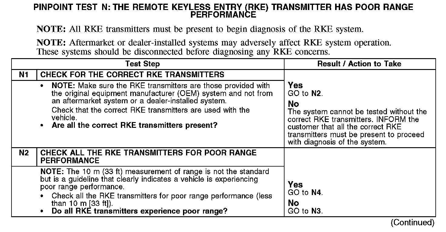 PINPOINT TEST N: THE REMOTE KEYLESS ENTRY (RKE) TRANSMITTER HAS POOR RANGE PERFORMANCENormal Operation